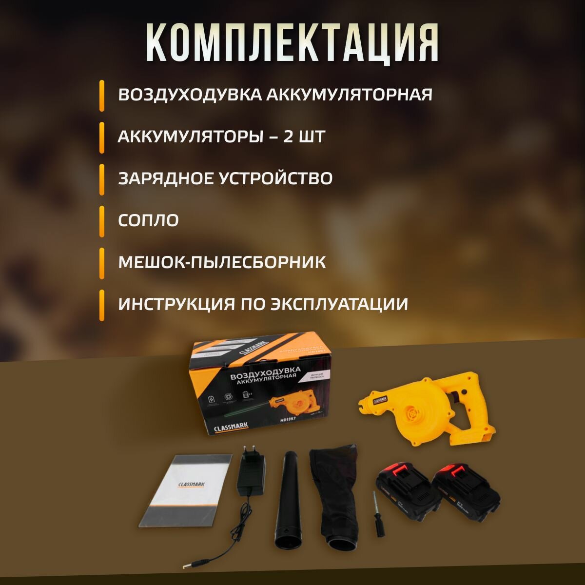 Воздуходувка аккумуляторная Classmark HD1357 электрическая, с функцией пылесоса, травосборник 2 л, скорость воздушного потока 75 м/с, черный и желтый интересное: