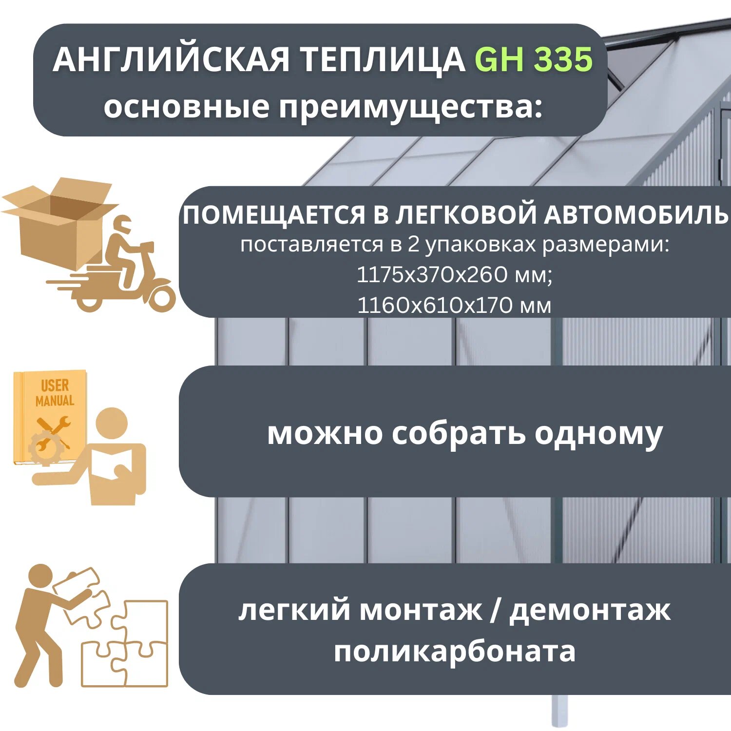 | Дополнительная информация | Размеры в собранном виде (ВхШхД) 195х178х335 см, вес 45.5 кг, алюминиевый профиль, поликарбонат 4 мм, две форточки, цвет антрацит. Быстрая сборка. Гарантия 1 год. |