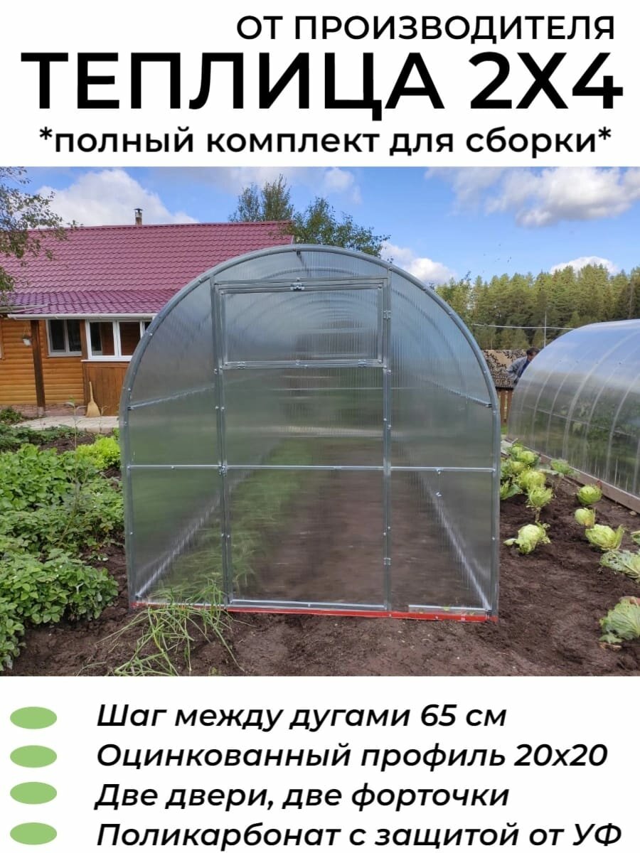 Теплица Арочная (Поликарбонат в комплекте), оцинкованный каркас 20*20 мм, полный комплект для сборки. 2х4х2.02 м, шаг 65 см