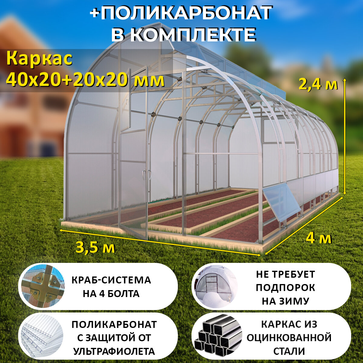 Купить Теплица по Митлайдеру (Поликарбонат в комплекте) 3.5 х 4 метра, оцинкованный каркас 40х20+20x20 мм - Митлайдер Премиум