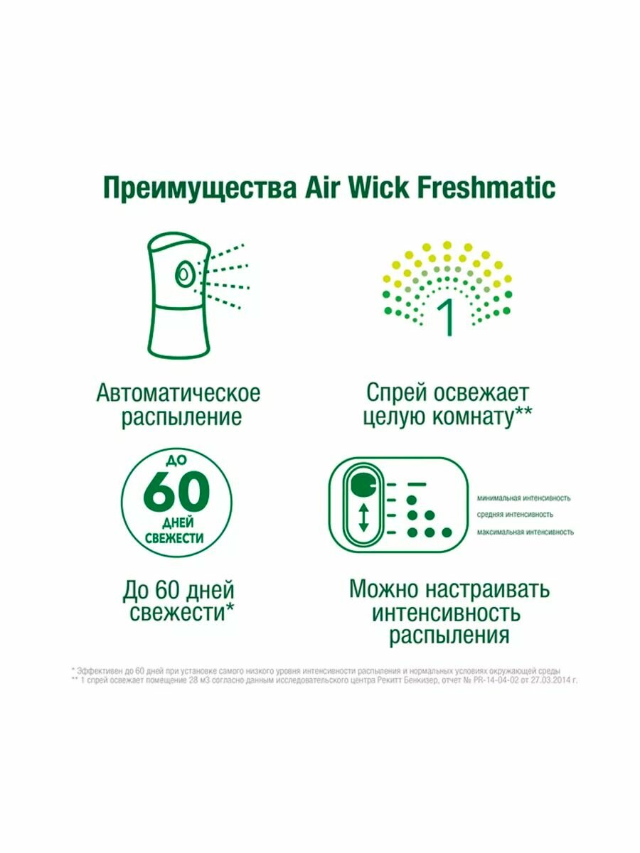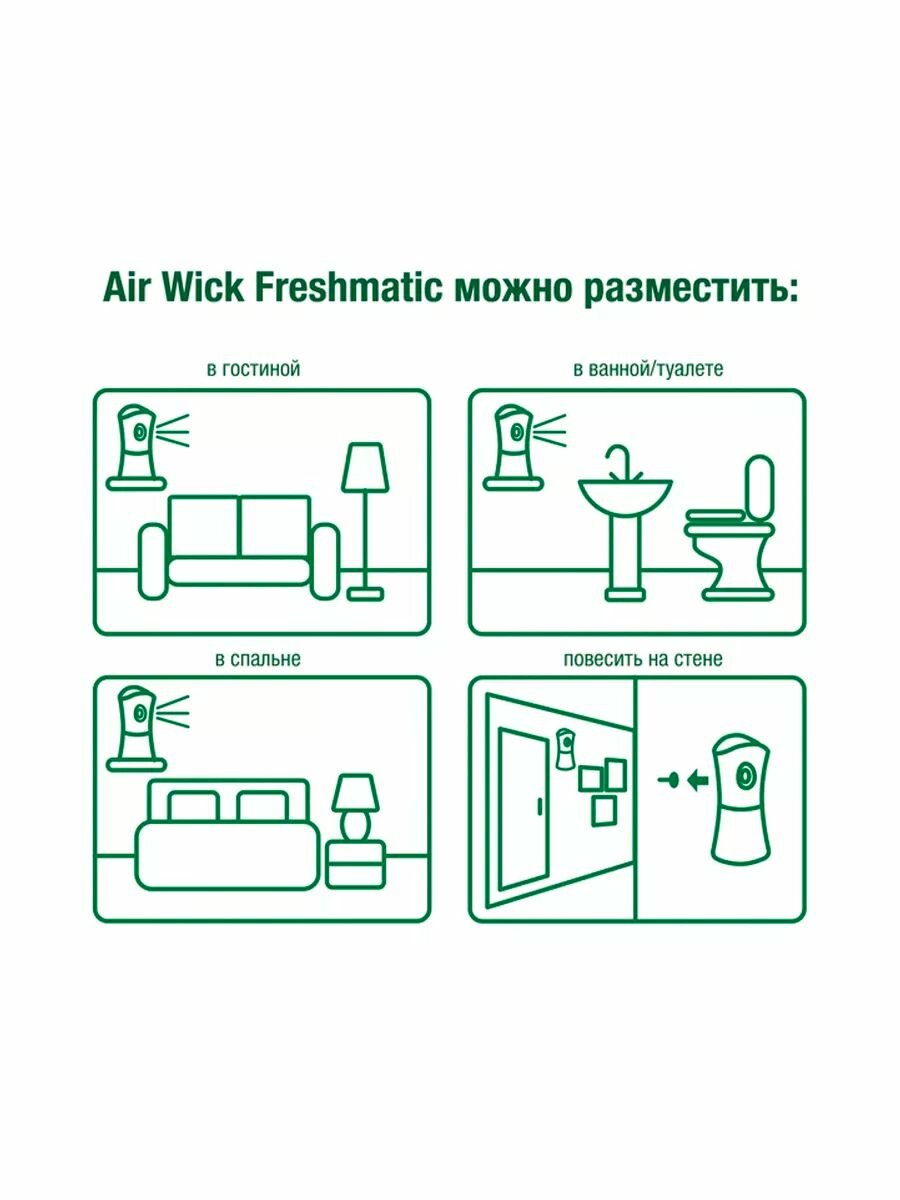 | Дополнительная информация | используйте только с диспенсером Air Wick Freshmatic; избегайте попадания прямых солнечных лучей и нагревания выше 50ºС |