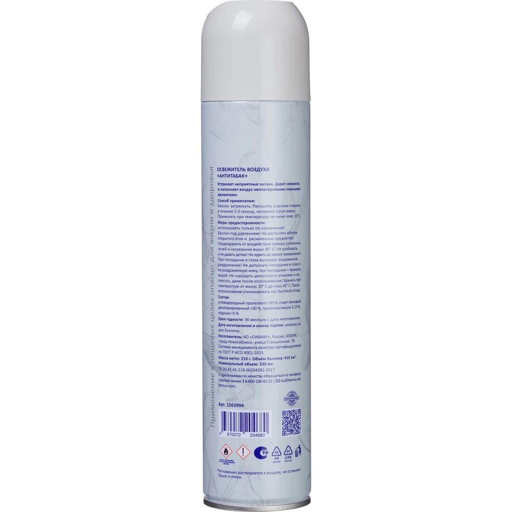 | Состав | углеводородный пропеллент >30%, спирт этиловый денатурированный >30%, пропиленгликоль 5–15%, отдушка |