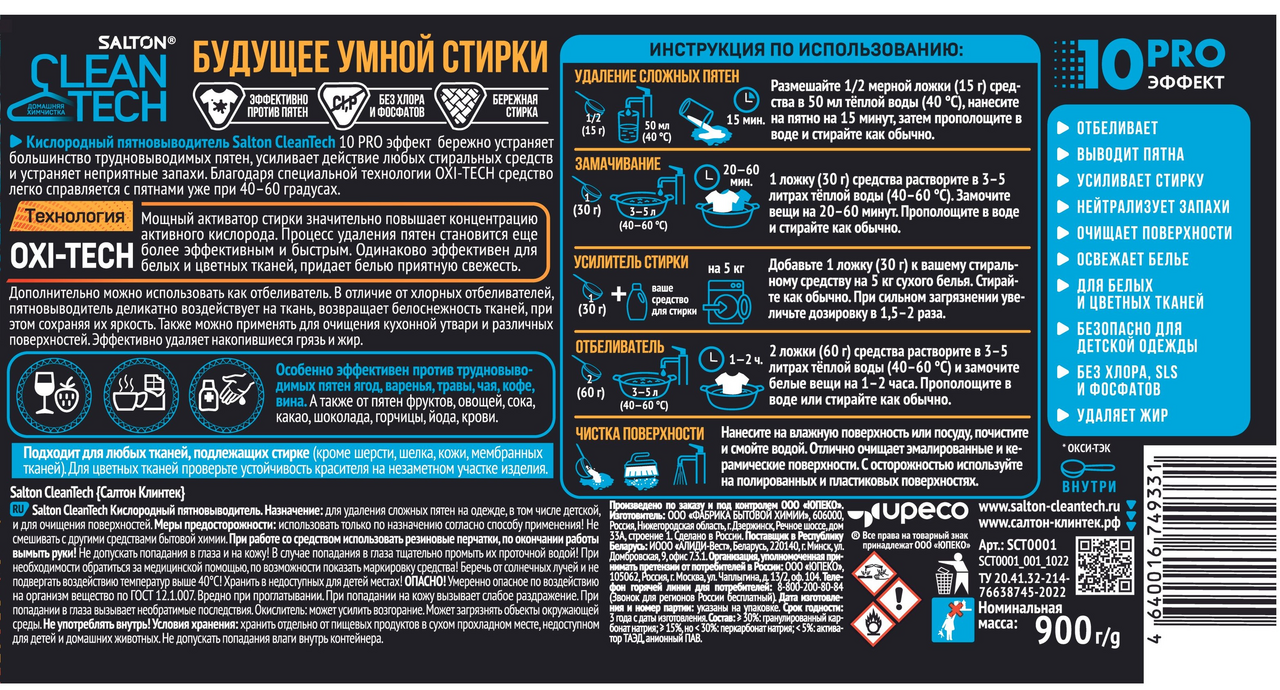 Универсальный Кислородный отбеливатель пятновыводитель Salton CleanTech 10 PRO эффект, 900 г х 1 шт.