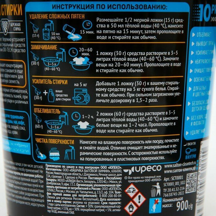 Купить Пятновыводитель Salton, CleanTech, 900 г, порошок, кислородный, SCT0001