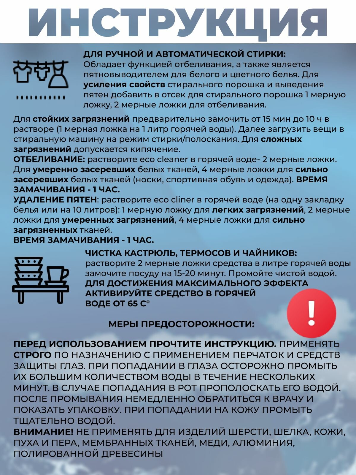 | Не содержит | аммиак / анионные ПАВ / искусственные красители / нефтепродукты / парабены / спирт / фосфаты / хлор |