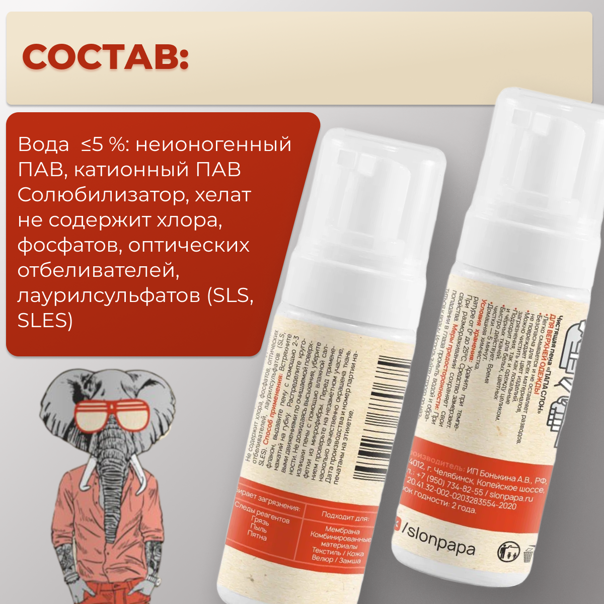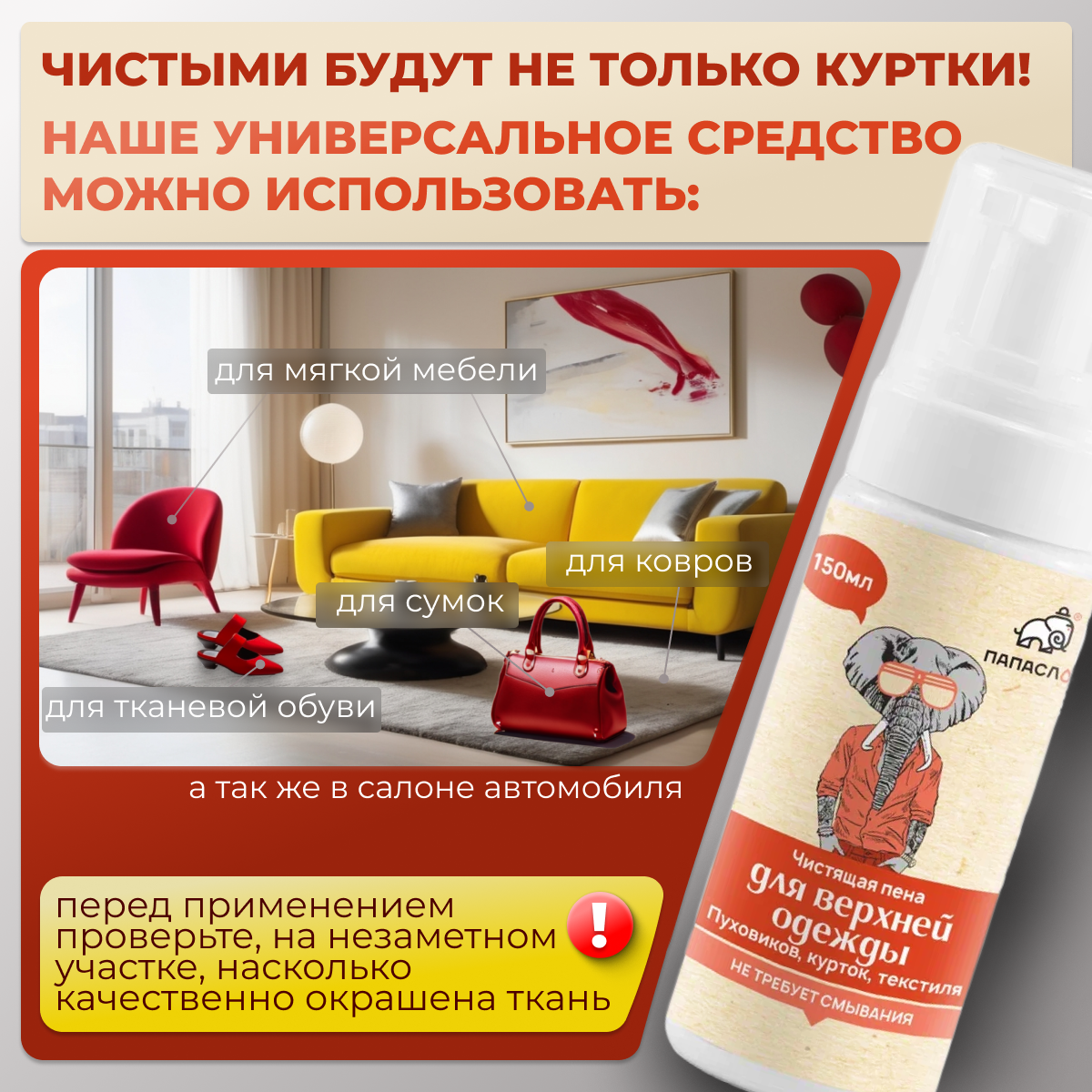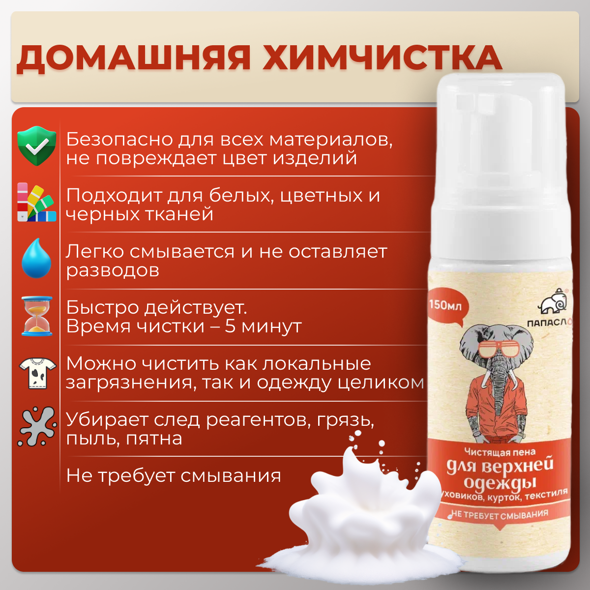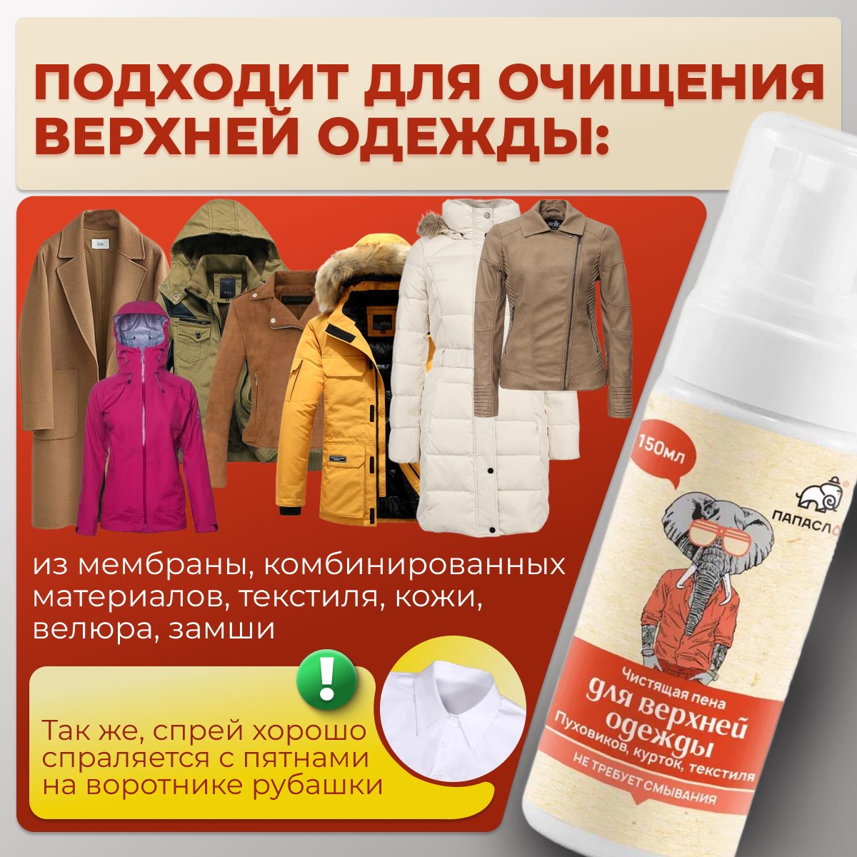 Пена очиститель для верхней одежды папа слон 150 мл, сухая химчистка для кожи, текстиля, велюра, замши, мембраны и комбинированных материалов интересное: