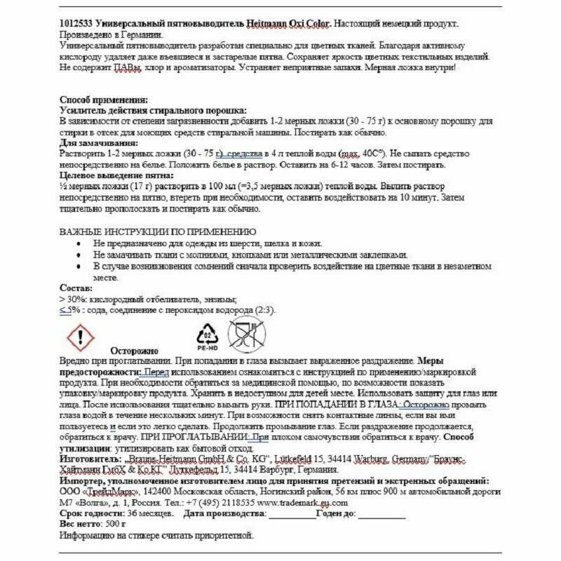 Пятновыводитель Heitmann Универсальный Oxi Color, 500 г