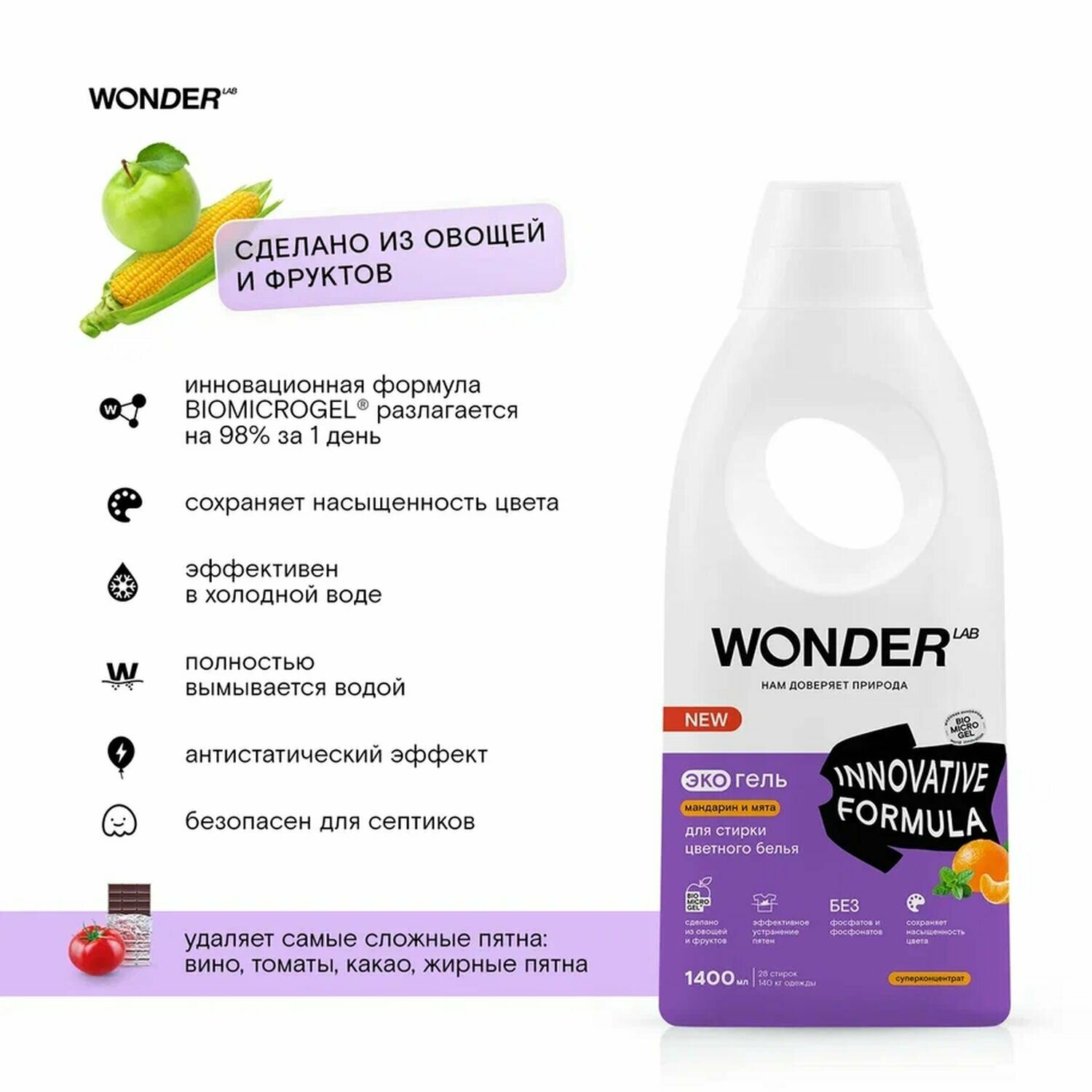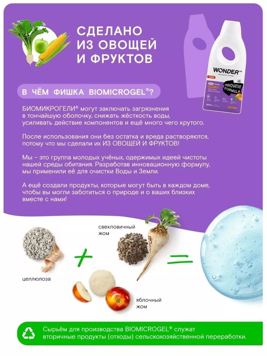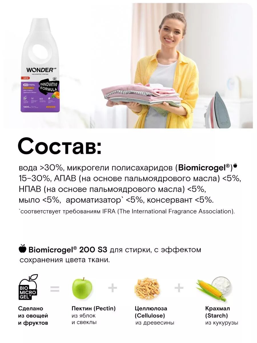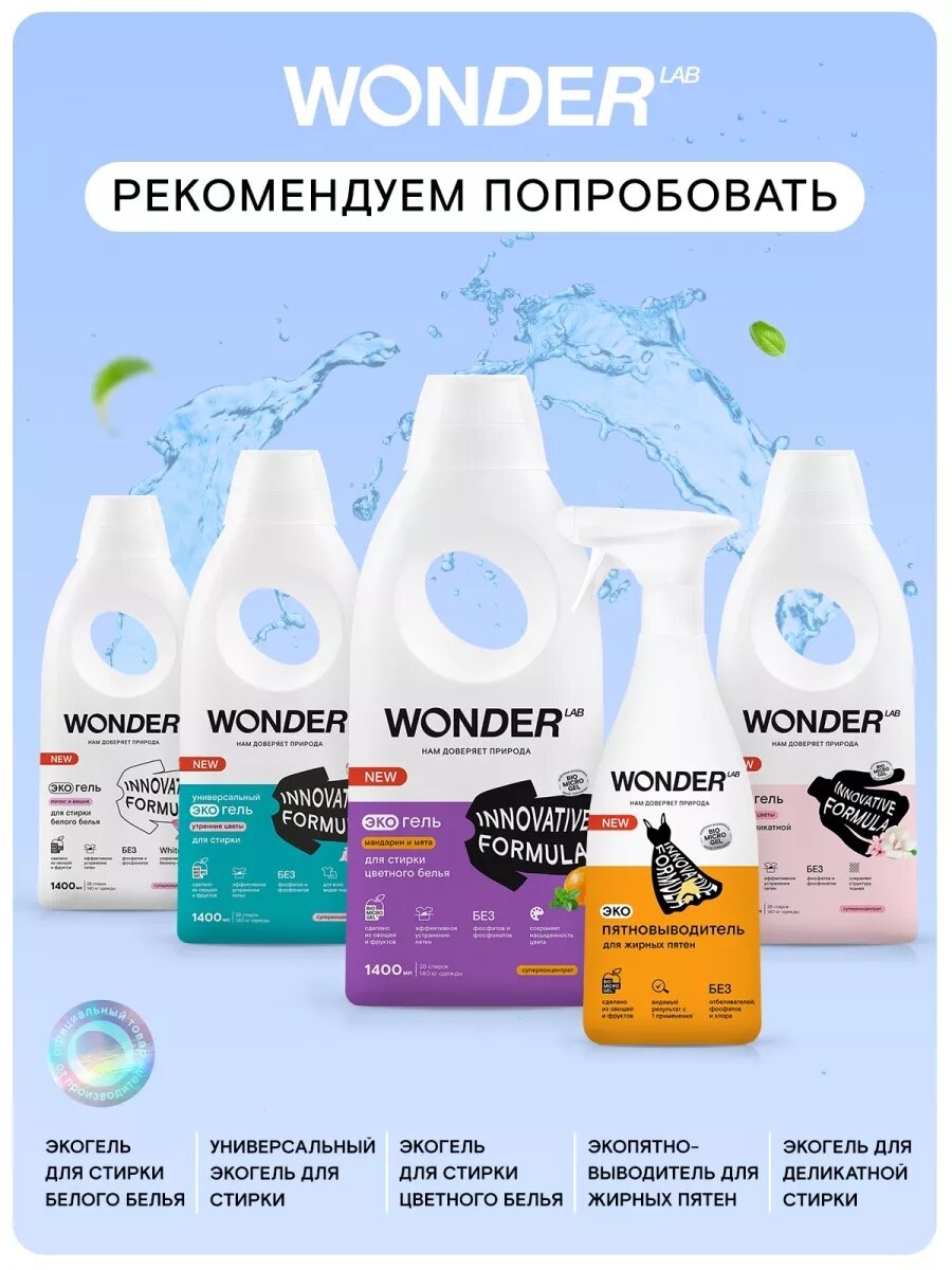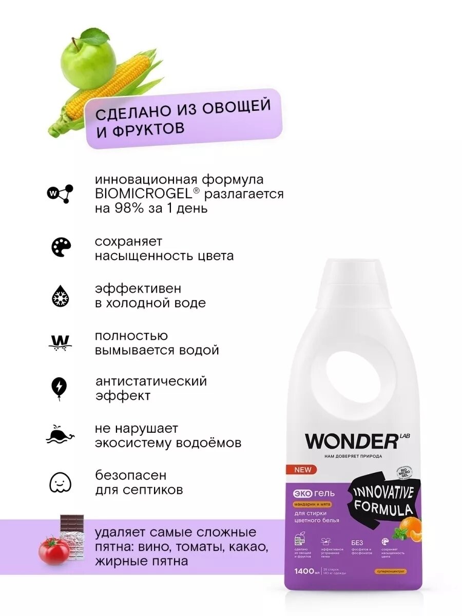 СохранитьWonder Lab экогель для стирки цветного белья мандарин и мята 1,4л интересное: