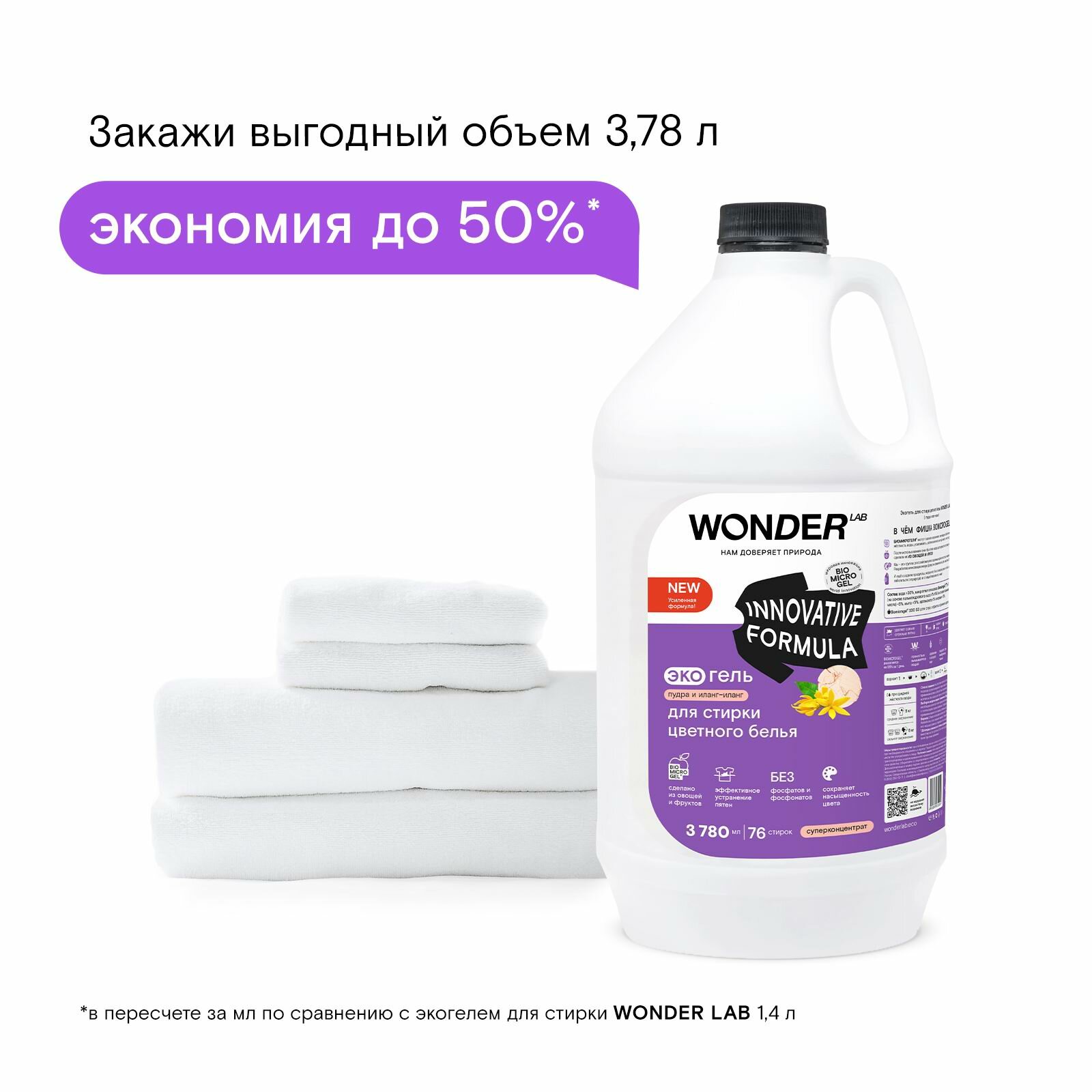 Эко гель для стирки цветного белья и одежды WONDER LAB, гипоаллергенный гель с ароматом пудры и иланг-иланг, 3780 мл