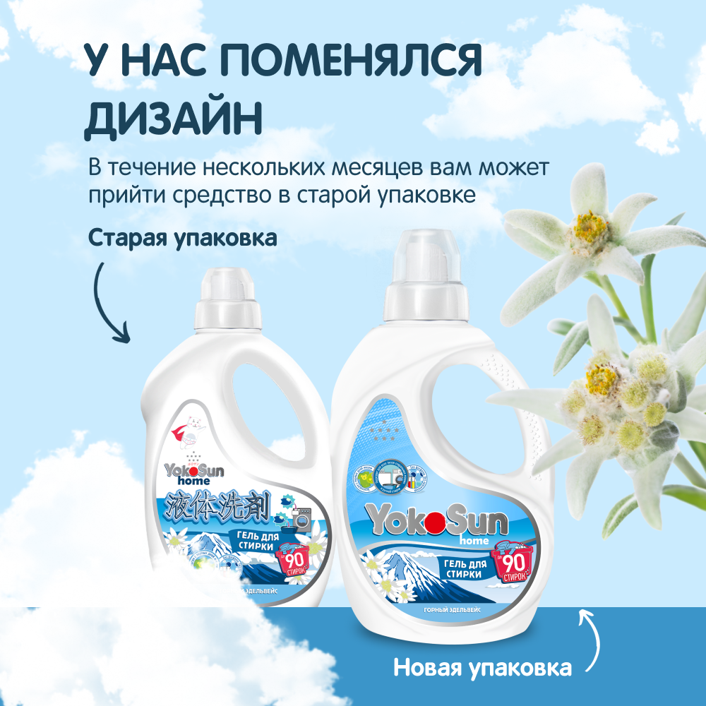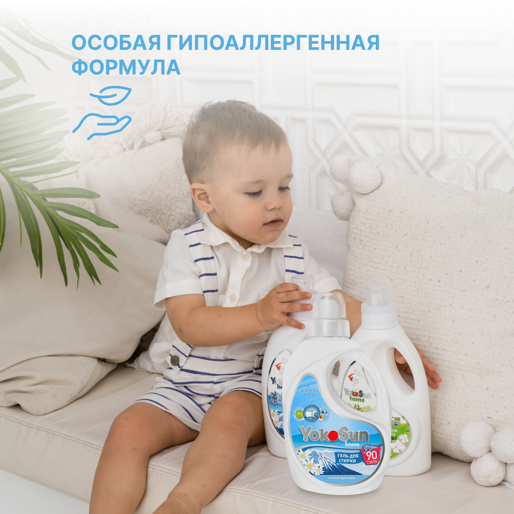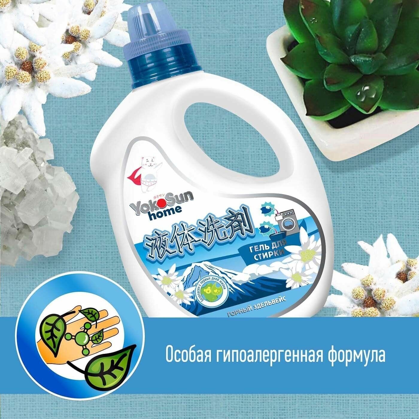 Гель для стирки YokoSun, Горный эдельвейс, 1л / Гипоаллергенный концентрированный универсальный жидкий стиральный порошок для белых и цветных вещей, для всех типов тканей, без хлора и фосфатов, эко, подходит с рождения