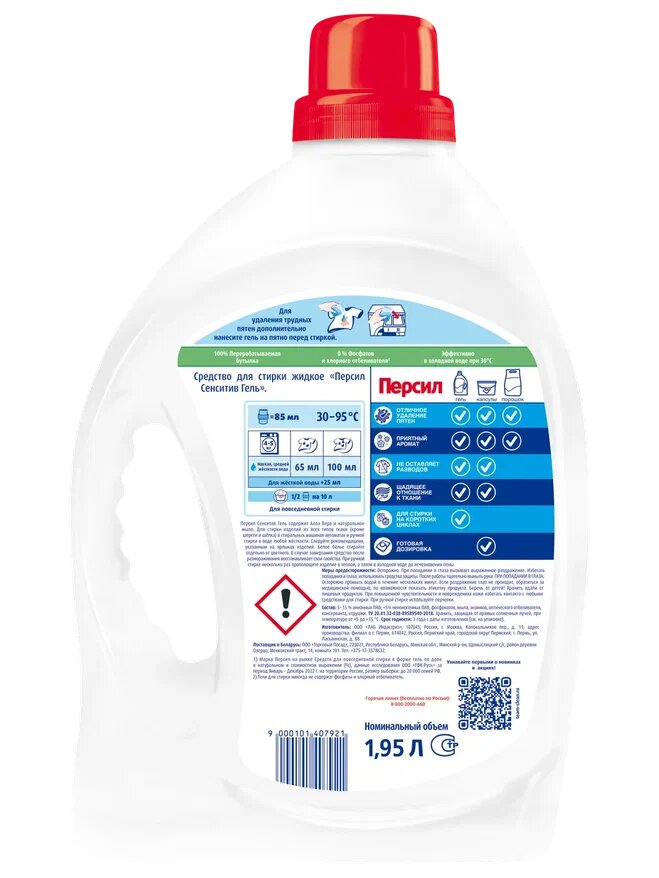 | Подробная комплектация | Гель для стирки Персил Sensitive для чувствительной кожи - 1,95л + концентрированный кондиционер ополаскиватель для стирки белья Вернель Детский - 0,91л |
