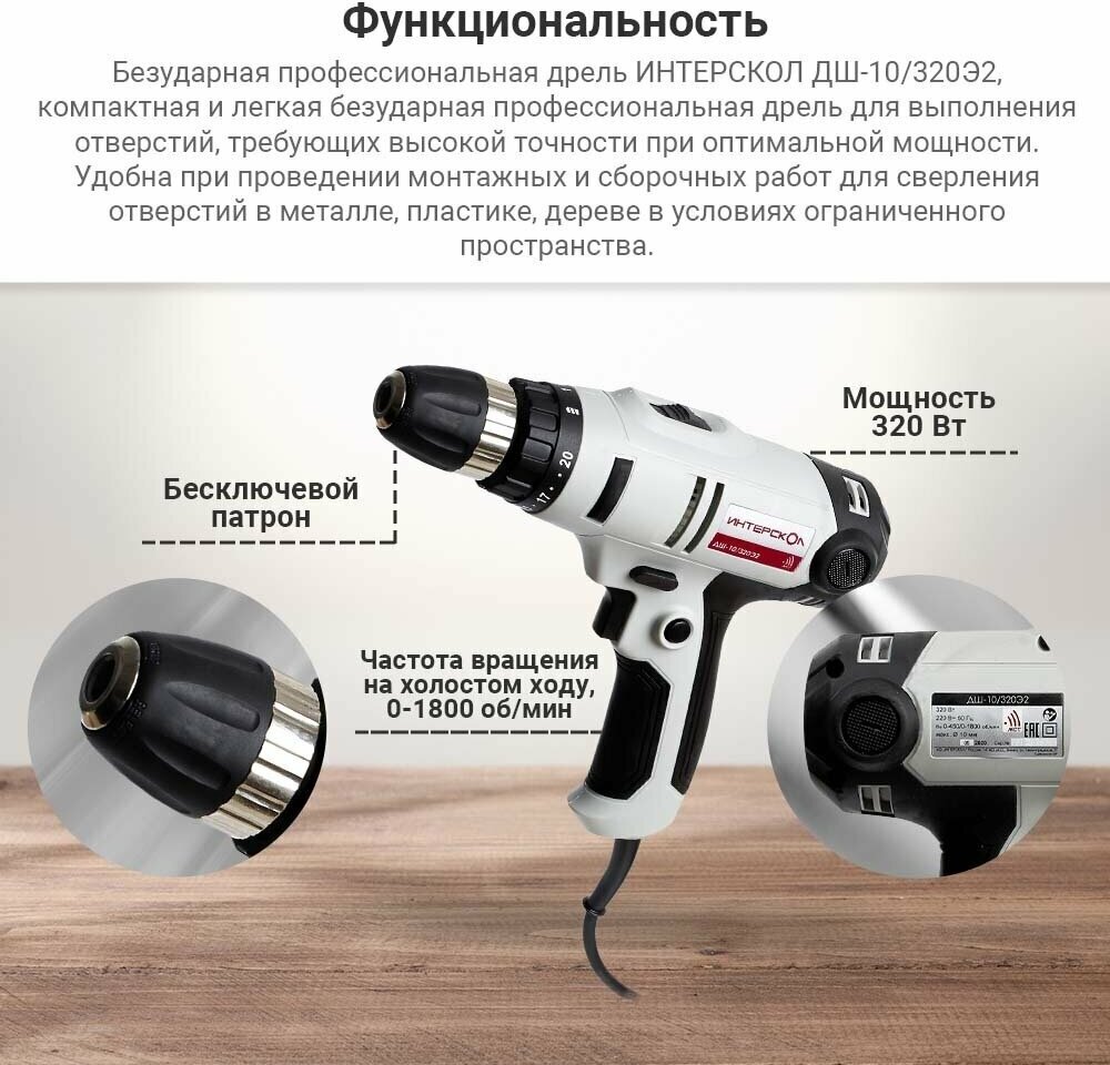 ИНТЕРСКОЛ ДШ-10/320Э2 дрель-шуруповерт сетевой 320Вт / ИНТЕРСКОЛ ДШ-10/320Э2 дрель-шуруповерт сетевая безударная 320Вт