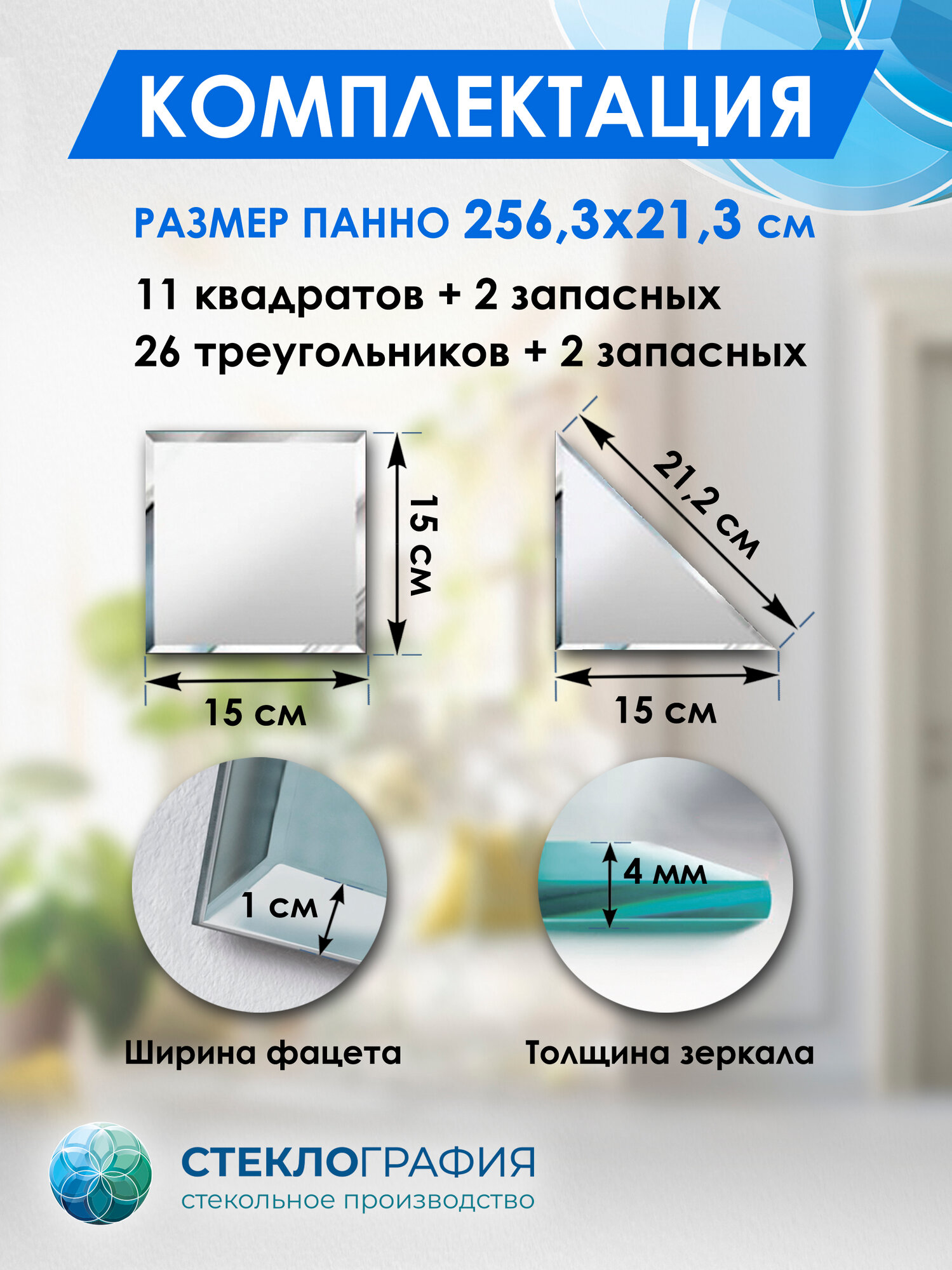 Ниже Вы можете прочитать отзывы на Зеркальное панно "Стеклография" с фацетом, на стену 256,3 см. х 21,3 см. из квадратов и треугольников., ознакомится с подробными характеристиками, посмотреть интересные обзоры и фотографии на Зеркальное панно "Стеклография" с фацетом, на стену 256,3 см. х 21,3 см. из квадратов и треугольников..