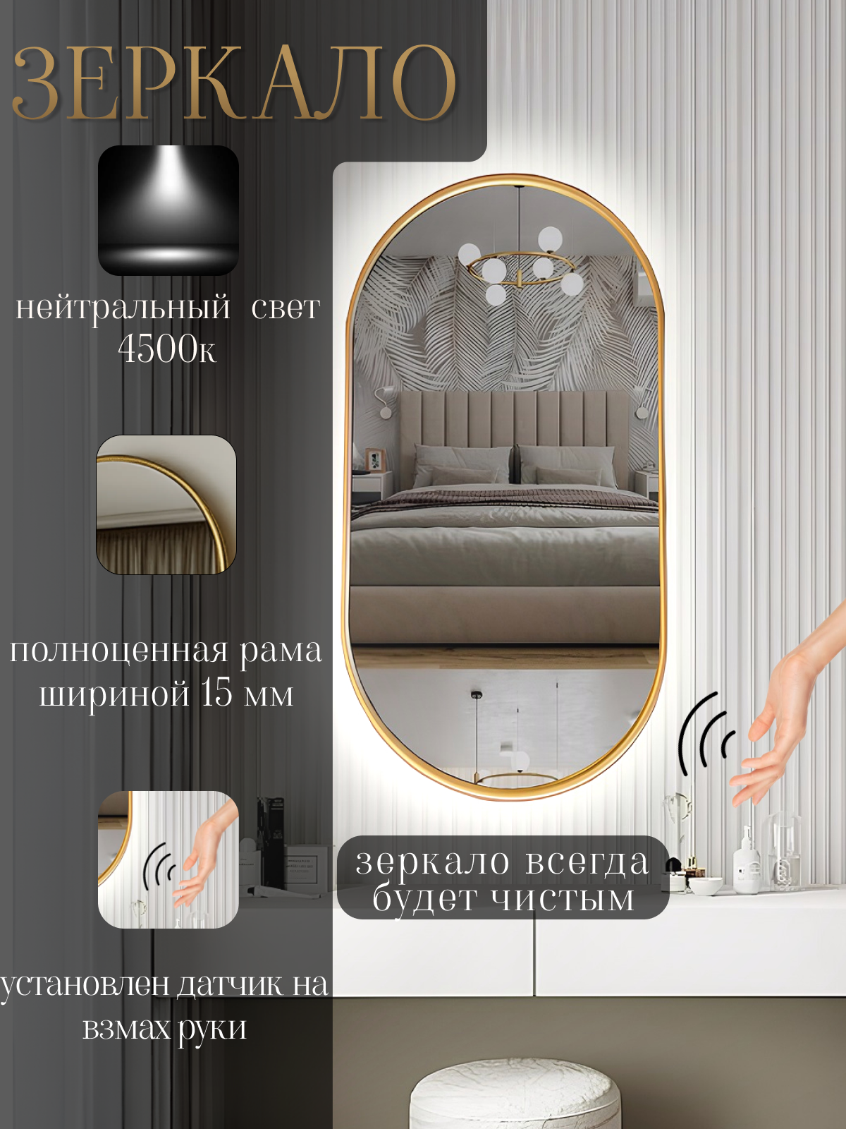 Овальное зеркало капсула в тонкой матовой золотой раме 111/57 см с нейтральной подсветкой с датчиком на взмах руки
