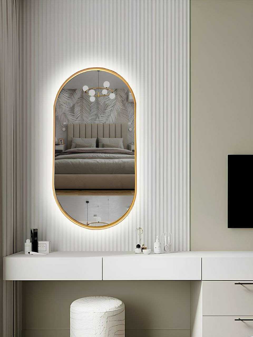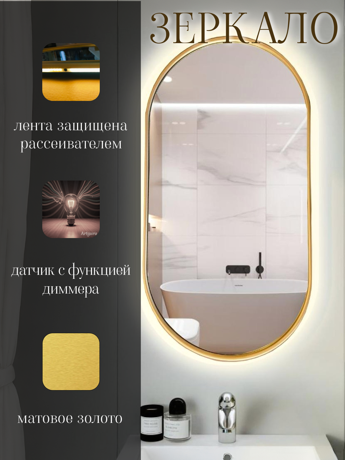 СохранитьОвальное зеркало капсула в тонкой матовой золотой раме 126/72 см с нейтральной подсветкой с датчиком на взмах руки интересное: