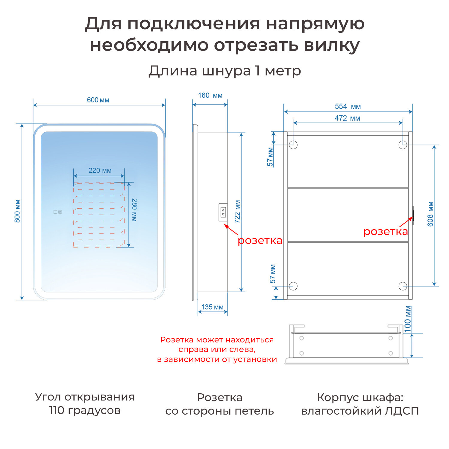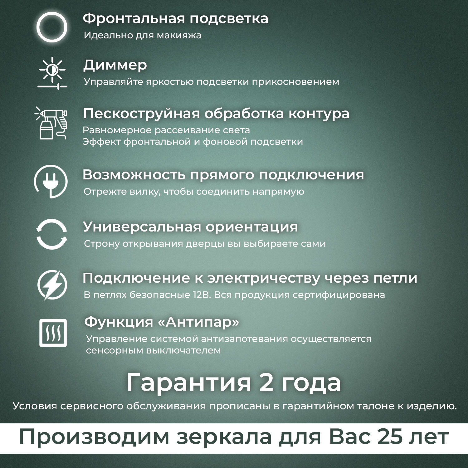 | Особенности | зеркало-шкаф, подогрев, подсветка |