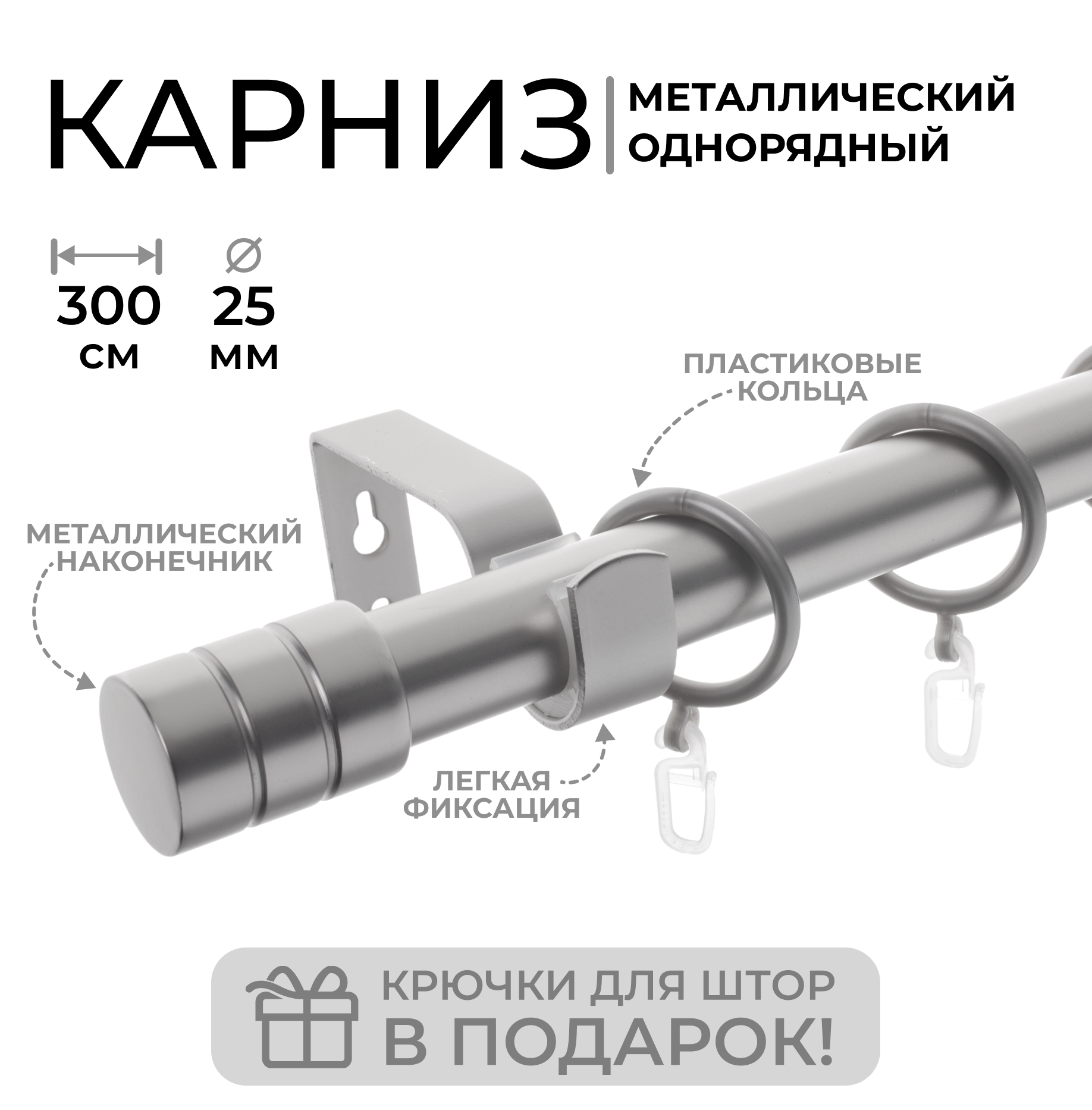 | Комплектация | Труба металлическая гладкая Ø25мм - 1шт; Наконечники металлические Заглушки Кронштейны металлические Кольца пластиковые + крючки Комплект крепежа (дюбеля, шурупы); Примечание: Размер карниза соответствует длине трубы без учета длины наконечников; |