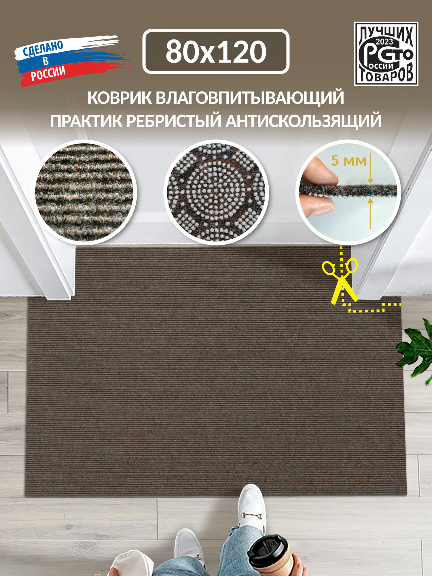 Коврик вырезной придверный icarpet практик антискользящий влаговпитывающий 80х120 мокко