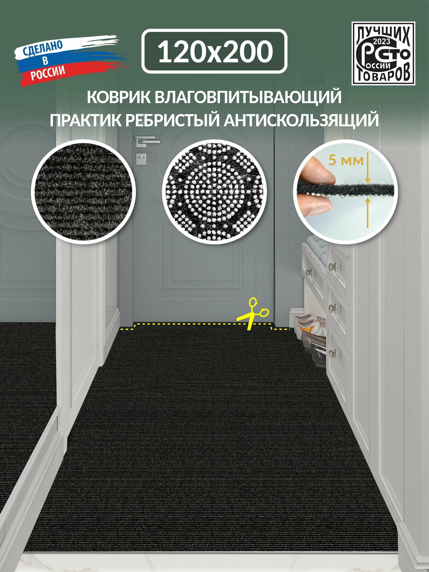 Коврик придверный вырезной SHAHINTEX ПРАКТИК Ребристый/ размер 120х200 см/ чёрный гранит, ковер для ванной, коврик для кухни, прикроватный