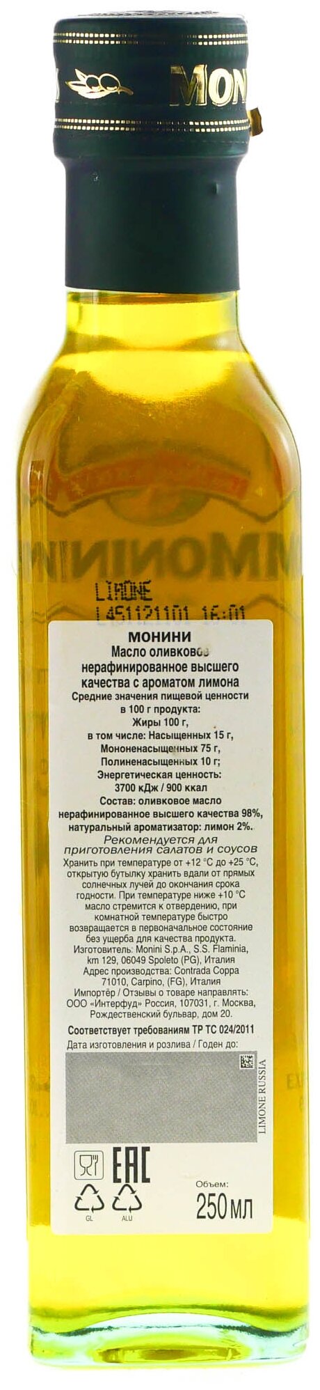 Масло оливковое MONINI Limone с ароматом лимона, Extra Vergine, 250мл