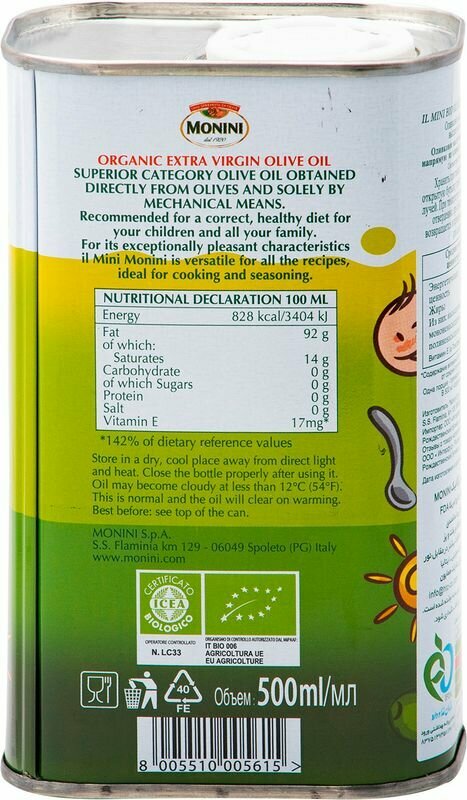 Оливковое масло MONINI, il Mini, BIO, нерафинированное высшего качества (Extra Virgin), ж/б, 500 мл