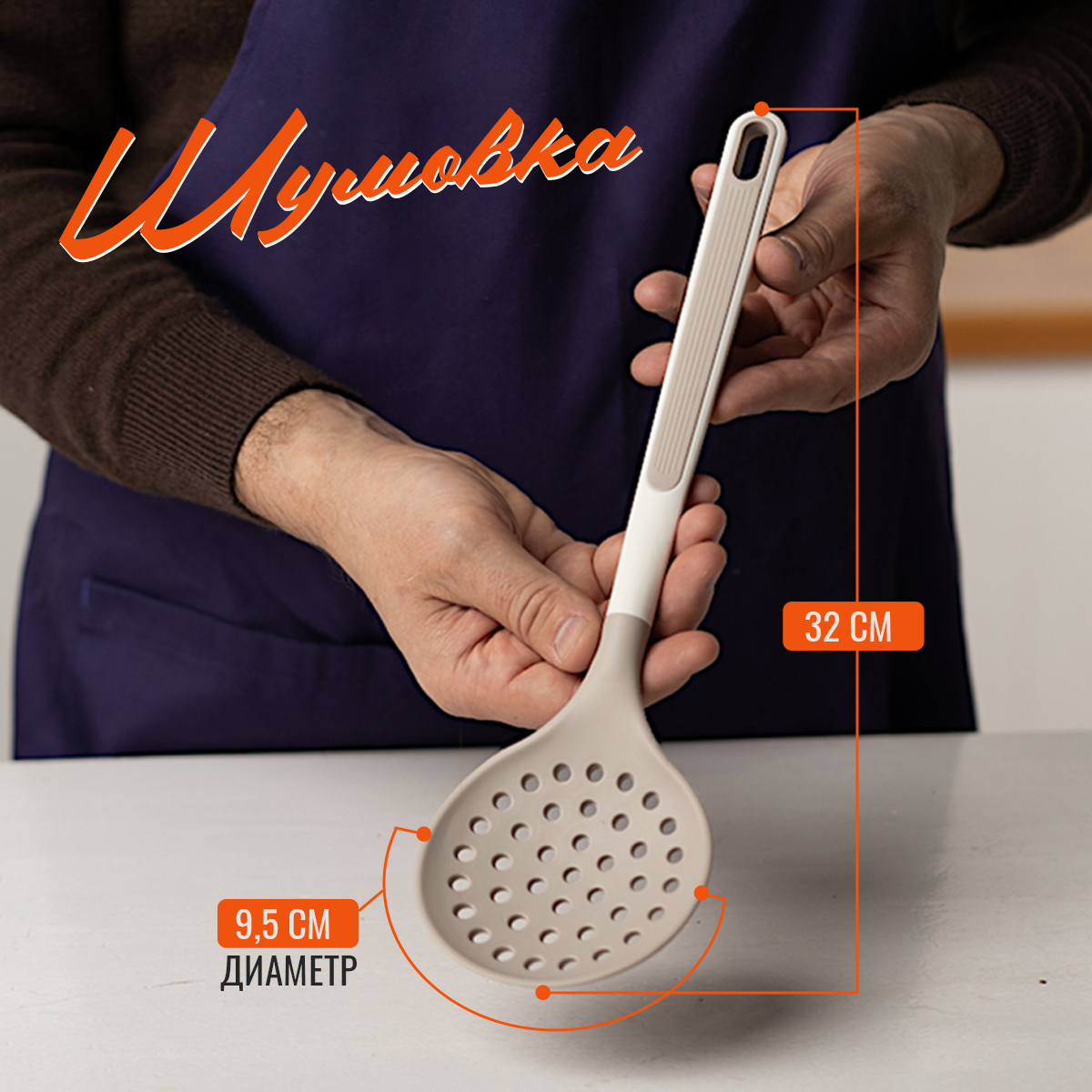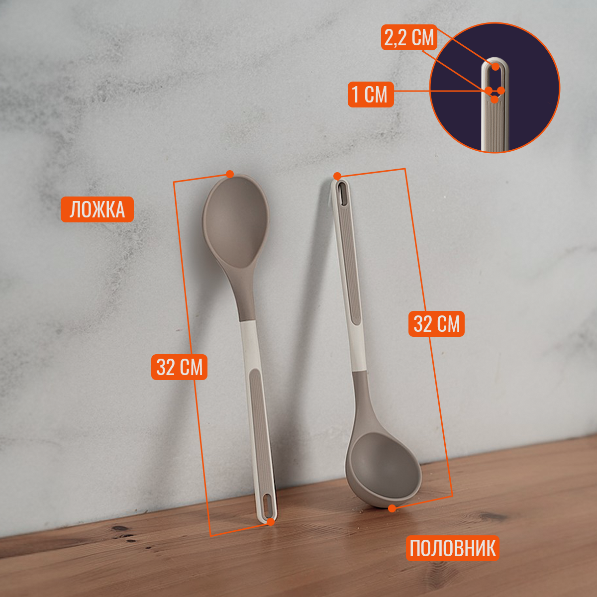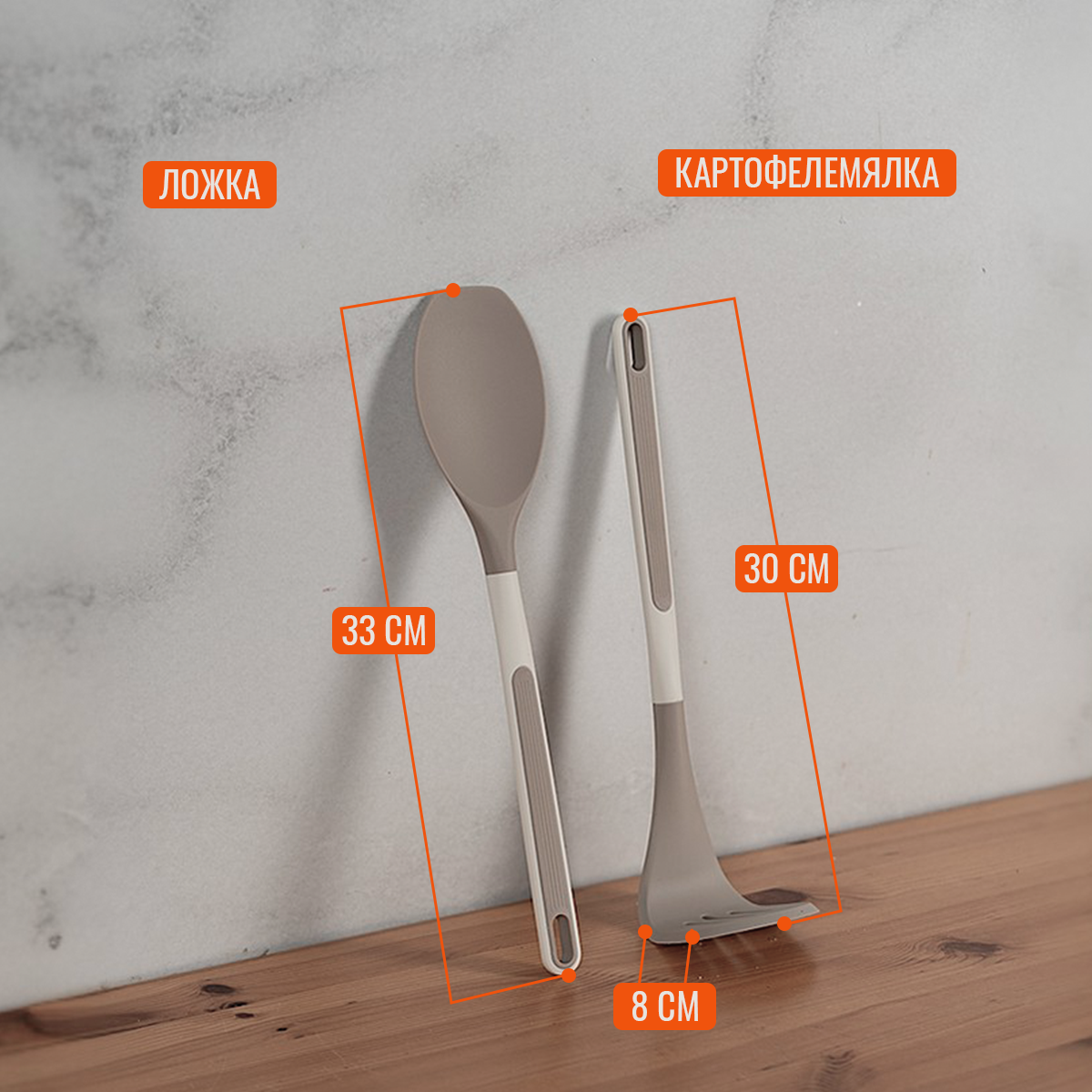 | Состав набора | венчик / картофелемялка / кисть кулинарная / ложка для спагетти / ложка поварская / ложка-дуршлаг / лопатка / половник / шумовка / щипцы |