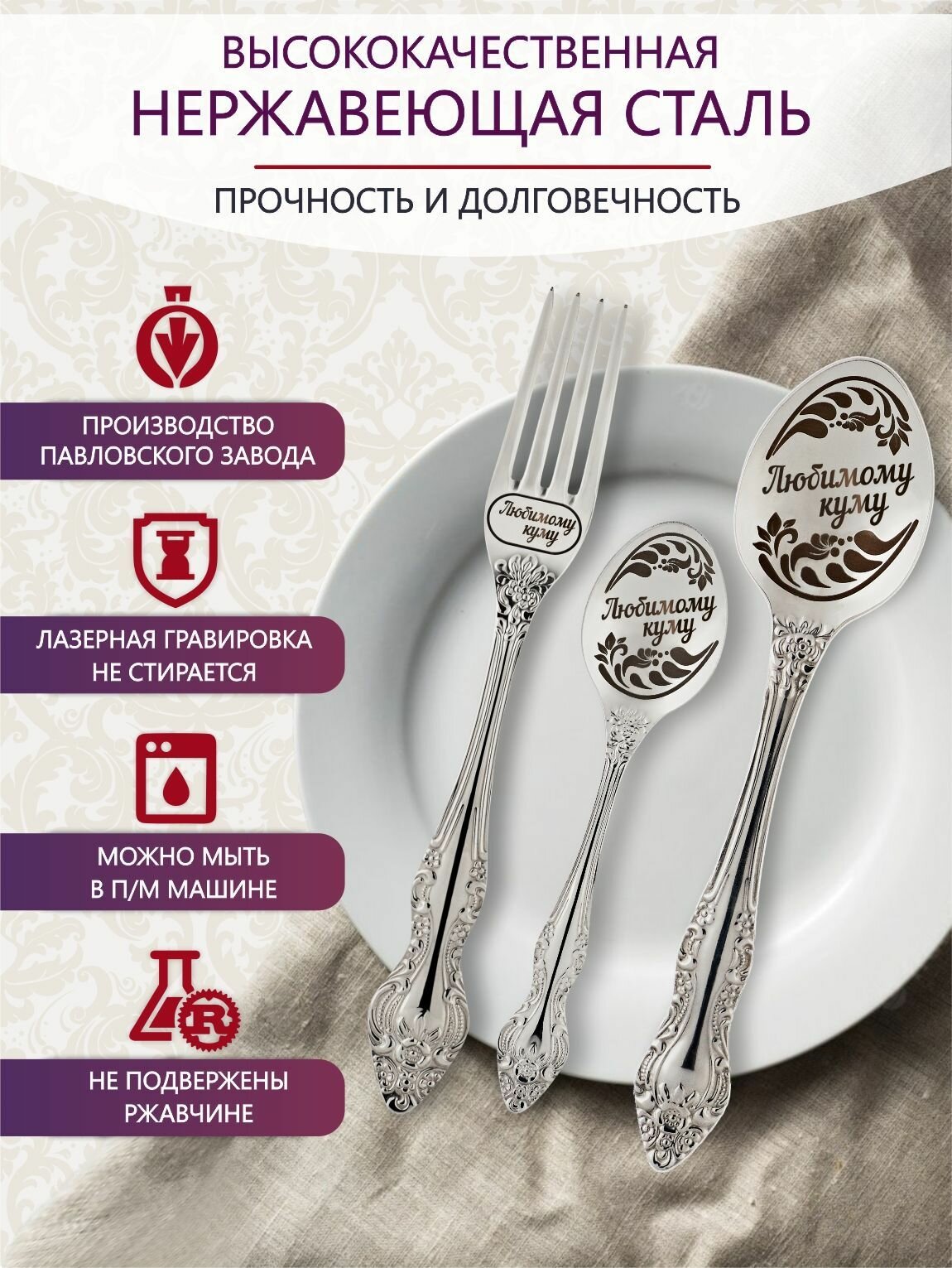СохранитьПодарочный столовый набор приборов Любимому куму из 3-х предметов на подставке интересное: