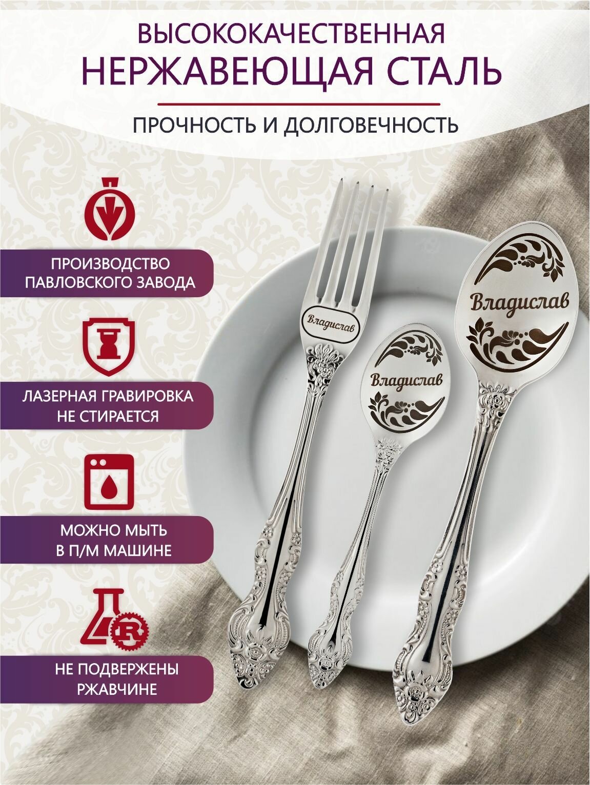 | В набор входит | Столовая ложка именная - 1 шт., столовая вилка именная - 1 шт., чайная ложка именная - 1 шт., деревянная резная подставка - 1 шт. |