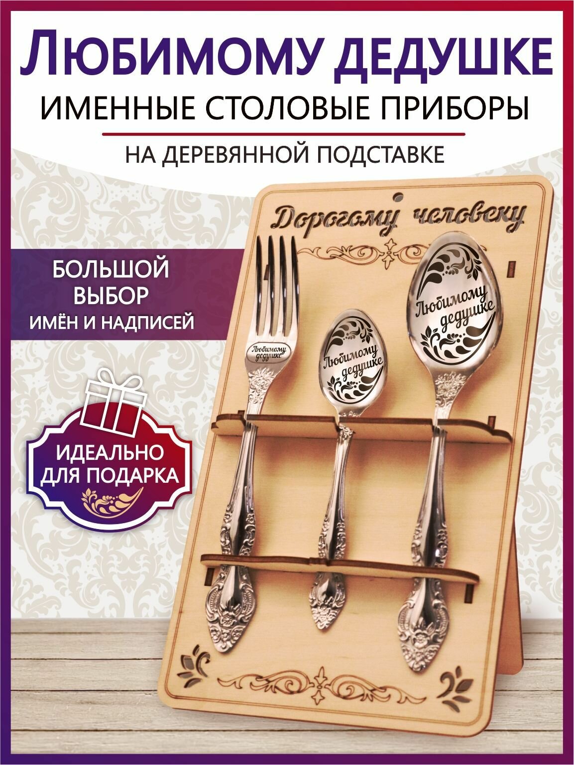 Купить Подарочный столовый набор приборов Любимому дедушке из 3-х предметов на подставке