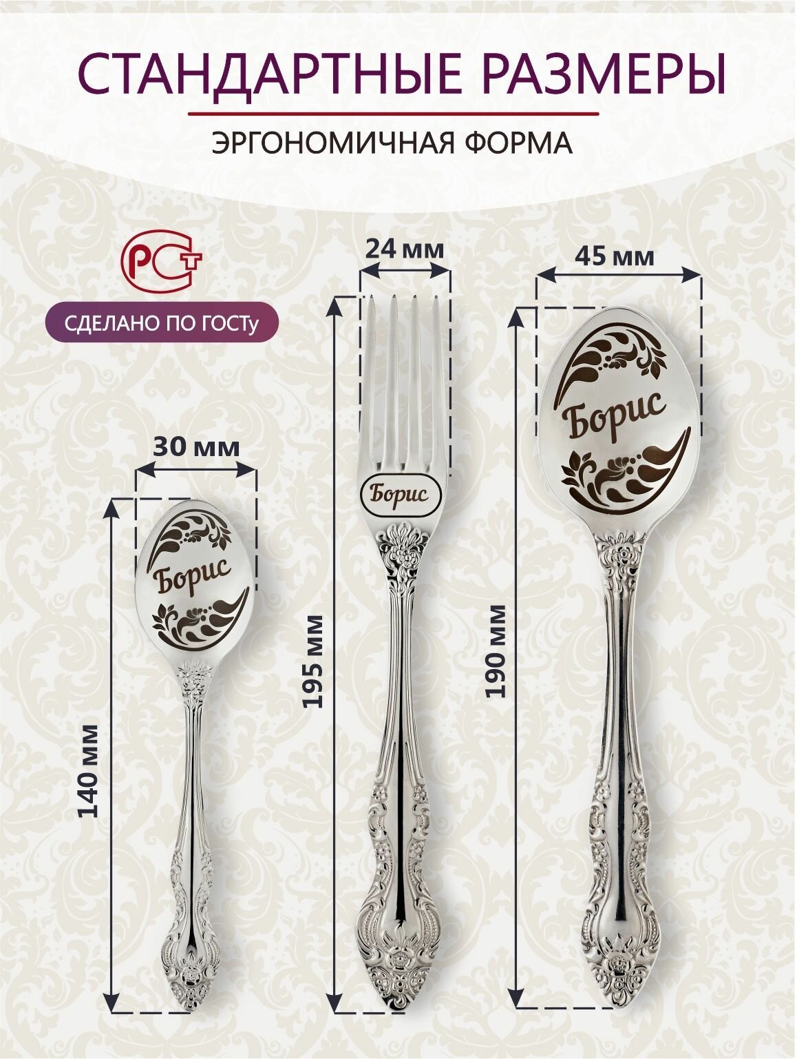 | В набор входит | Столовая ложка именная - 1 шт., столовая вилка именная - 1 шт., чайная ложка именная - 1 шт., деревянная резная подставка - 1 шт. |