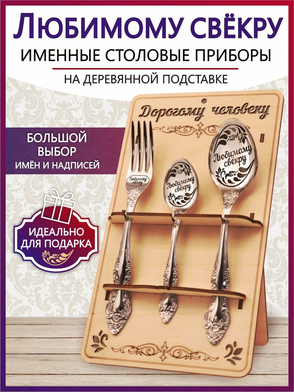 СохранитьПодарочный столовый набор приборов Любимому свекру из 3-х предметов на подставке интересное: