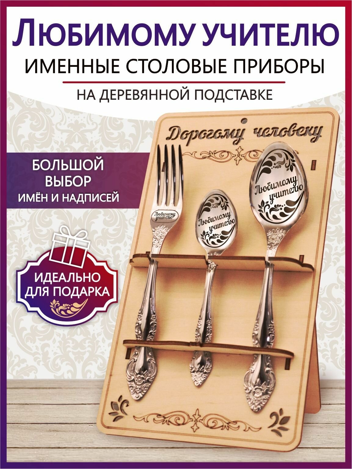 Купить Подарочный столовый набор приборов Любимому учителю из 3-х предметов на подставке