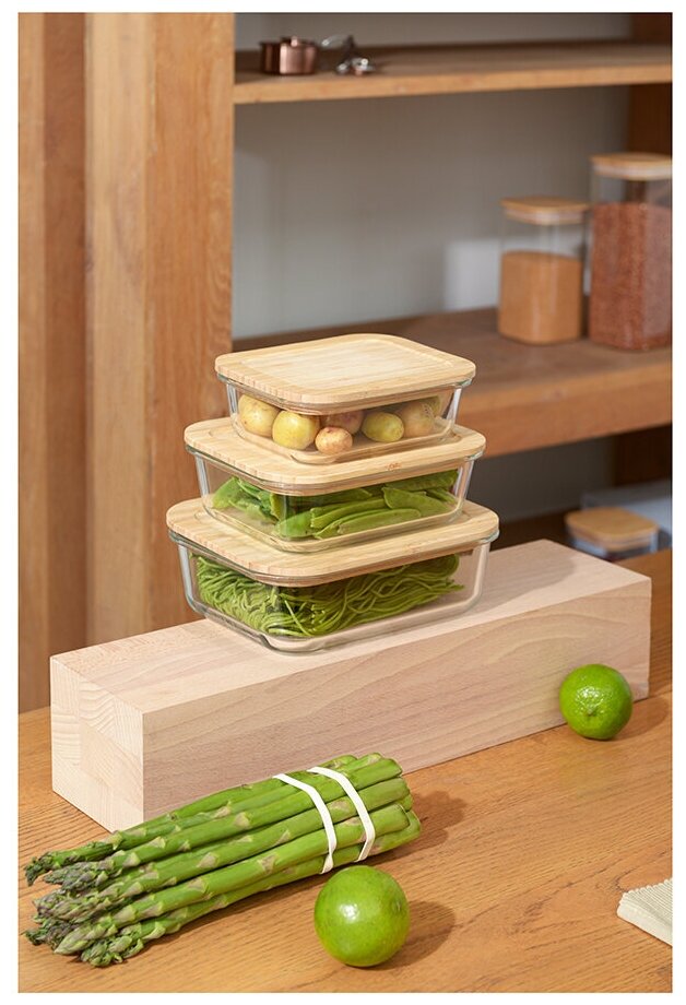 Набор стеклянных прямоугольных контейнеров Smart Solutions с бамбуковыми крышками, 3 шт. (SFE-SS-CN-GLS-BM-RC1.05)