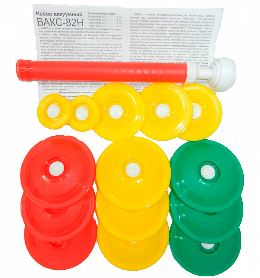 | Комплектация | Крышка КВК-82 (для обычных и резьбовых банок с горловиной 82 мм) - 9 шт., Крышка КВК-70 (для банок всех типов с горловиной от 42 до 70 мм) - 3 шт., Крышка КВК-38 (для банок с горловиной 38 мм) - 2 шт., Ручной вакуумный насос НВР (обеспечивает вакуум глубиной до 90%) - 1 шт. |