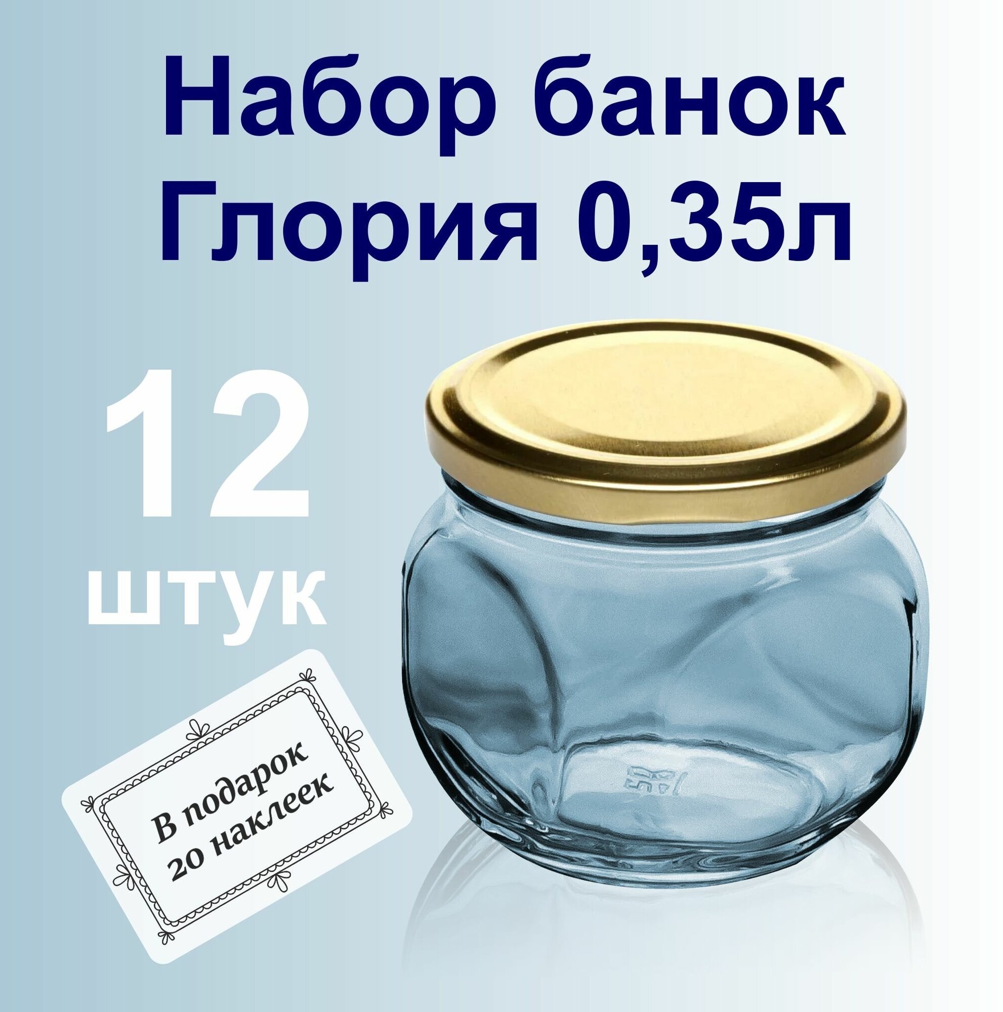 | Комплектация | Банка стеклянная - 12 штук; Крышка ТвистОфф металлическая - 12 штук; Наклейки - 20 штук |
