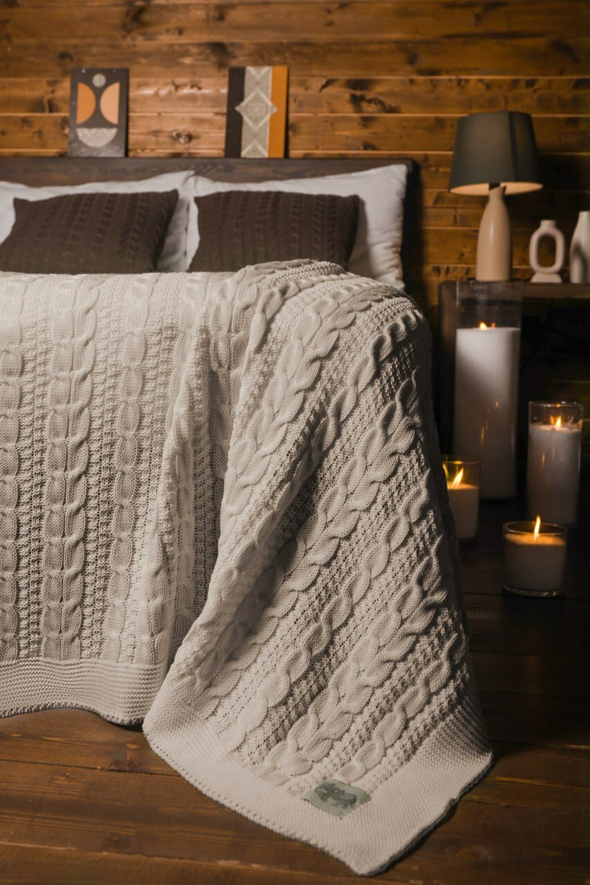 Плед 180х220, вязаный, Warm Whiff, светло-коричневый, хлопок, покрывало на кровать, на диван, на кресло, в подарочной коробке