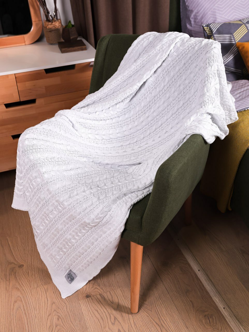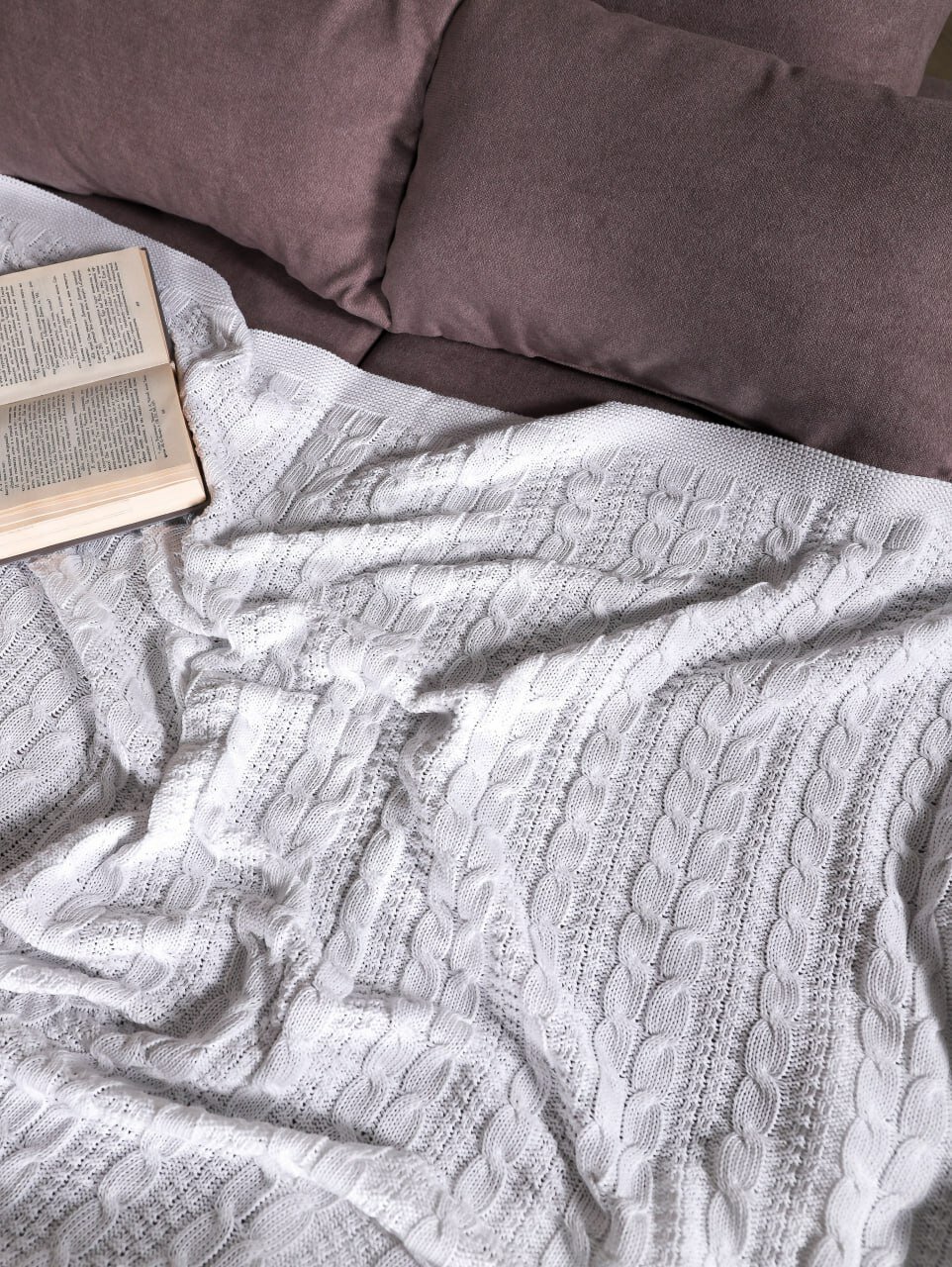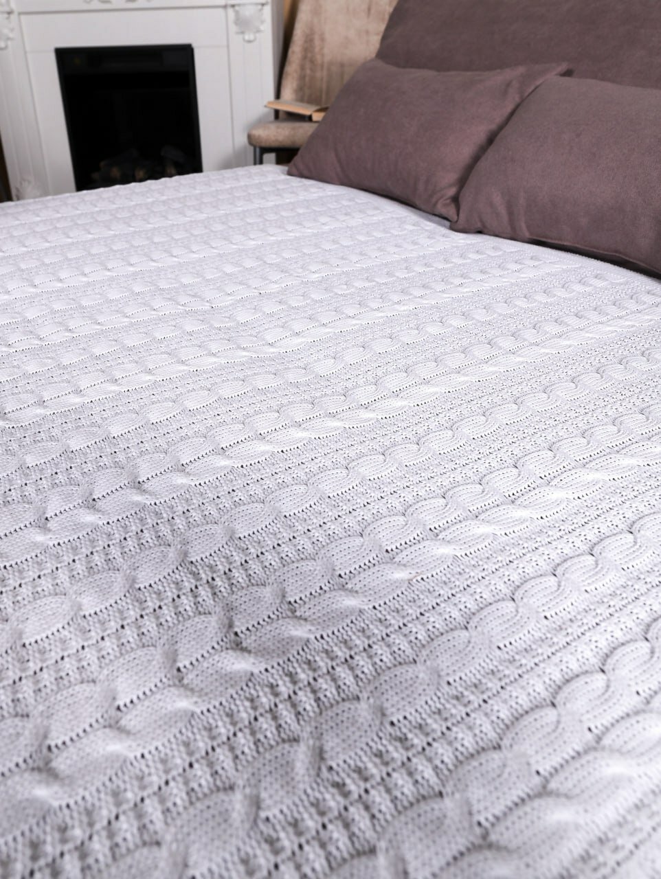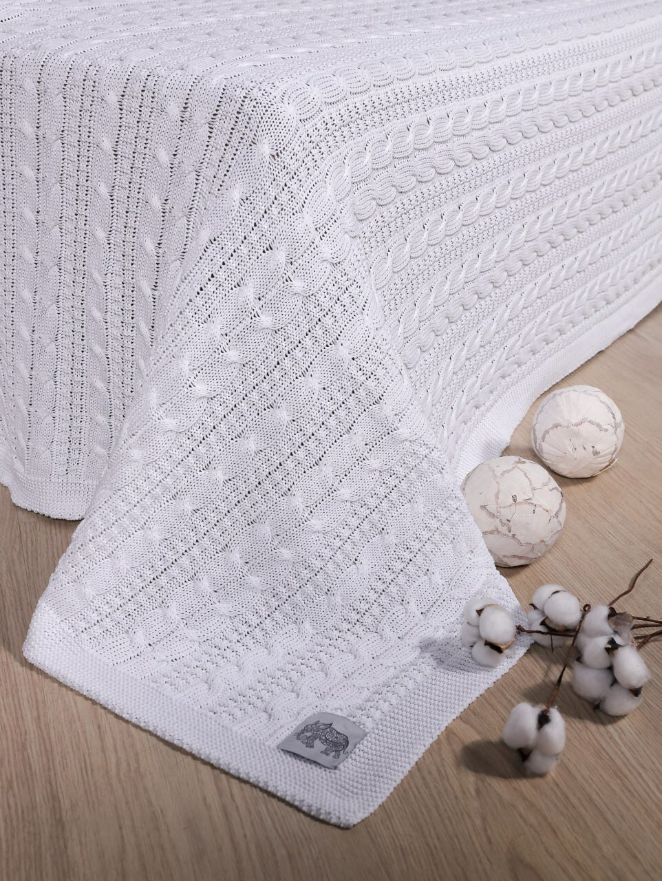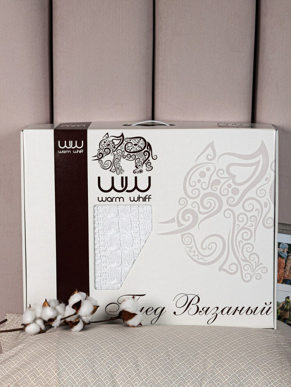 Плед 180х220, вязаный, Warm Whiff, белый, хлопок, покрывало на кровать, на диван, на кресло, в подарочной коробке
