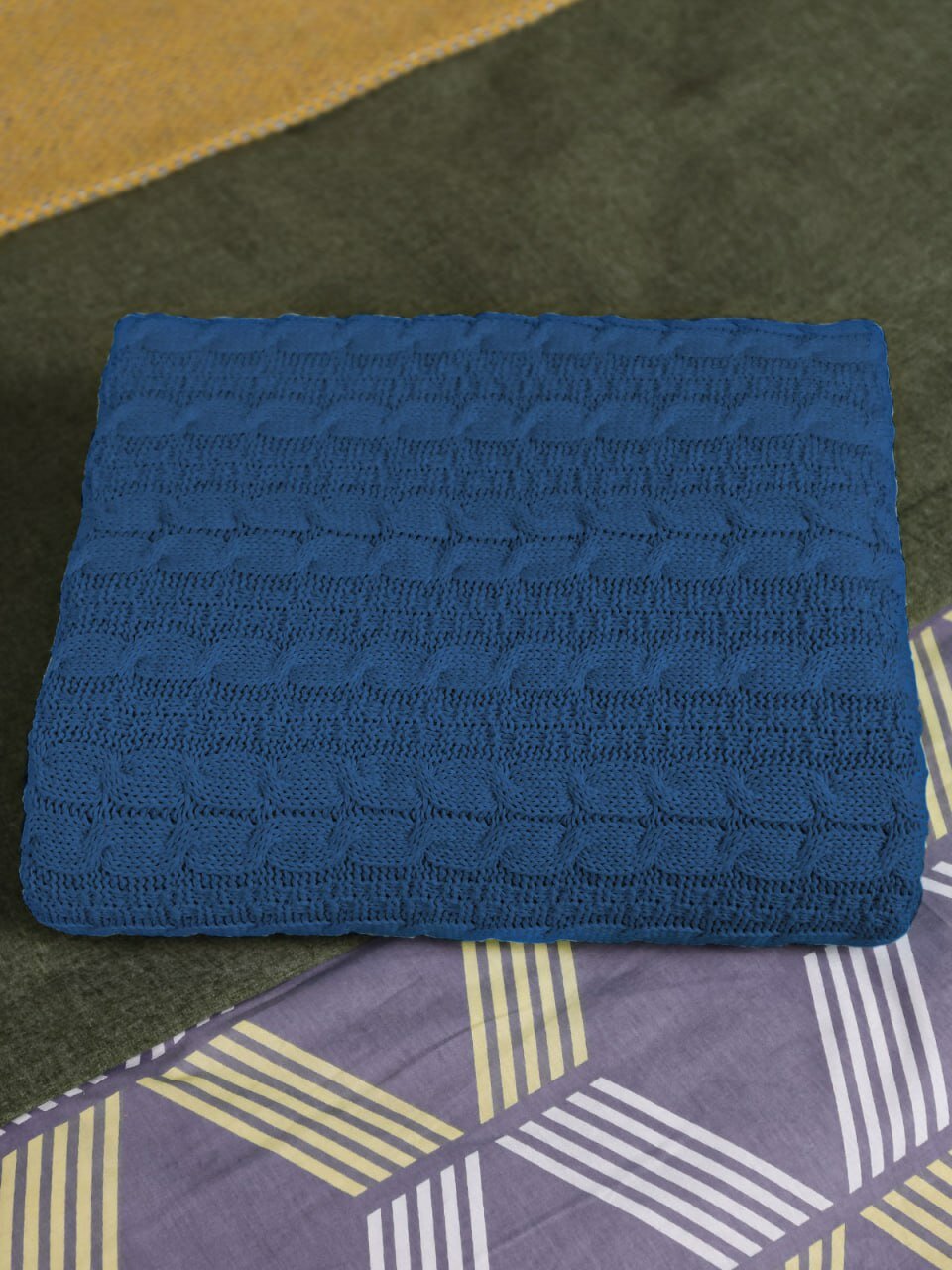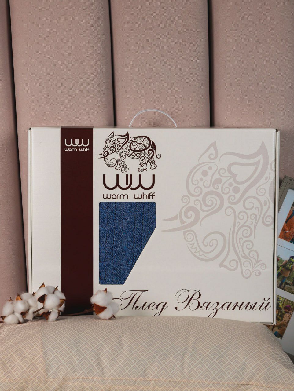 Плед 180х220, вязаный, Warm Whiff, темно-синий, хлопок, покрывало на кровать, на диван, на кресло, в подарочной коробке