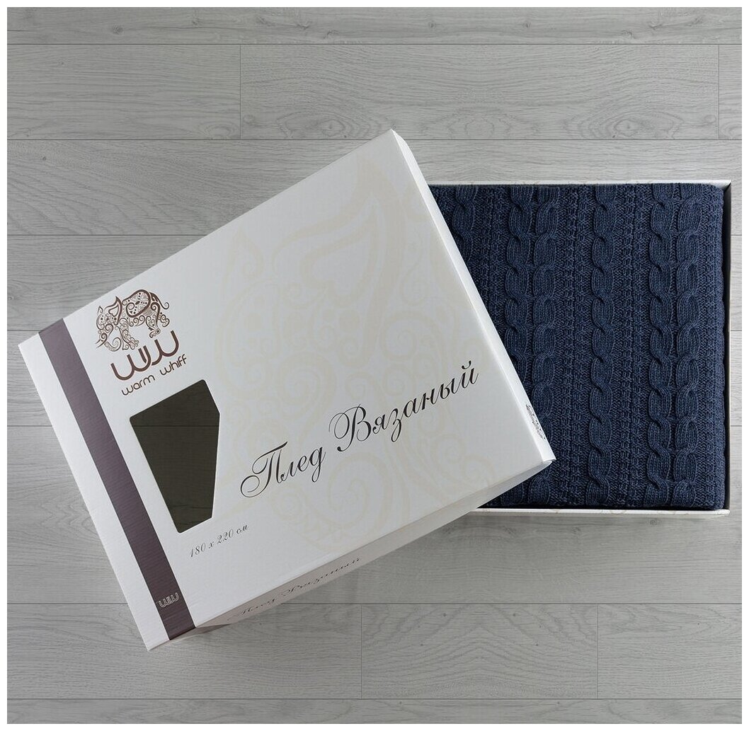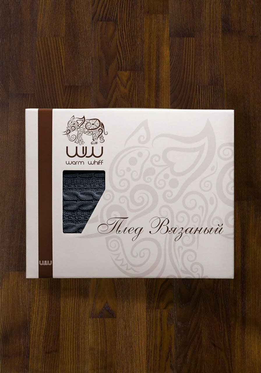 Плед 180х220, вязаный, Warm Whiff, серо-синий, хлопок, покрывало на кровать, на диван, на кресло, в подарочной коробке