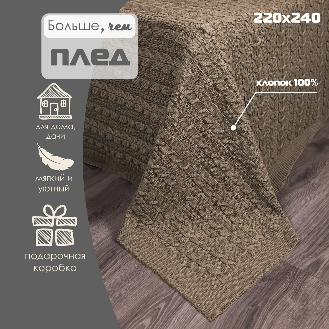 Плед 180х220, вязаный, Warm Whiff, коричневый, хлопок, покрывало на кровать, на диван, на кресло, в подарочной коробке