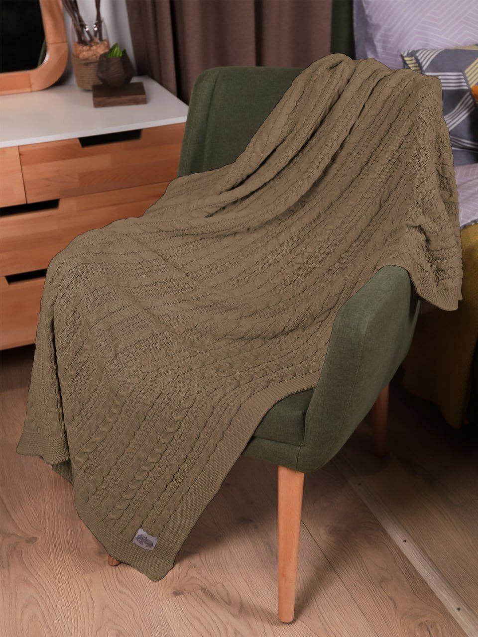 Плед 220х240, вязаный, Warm Whiff, хаки, хлопок 100%, покрывало на кровать, на диван, на кресло, большой, тонкий, в подарочной коробке