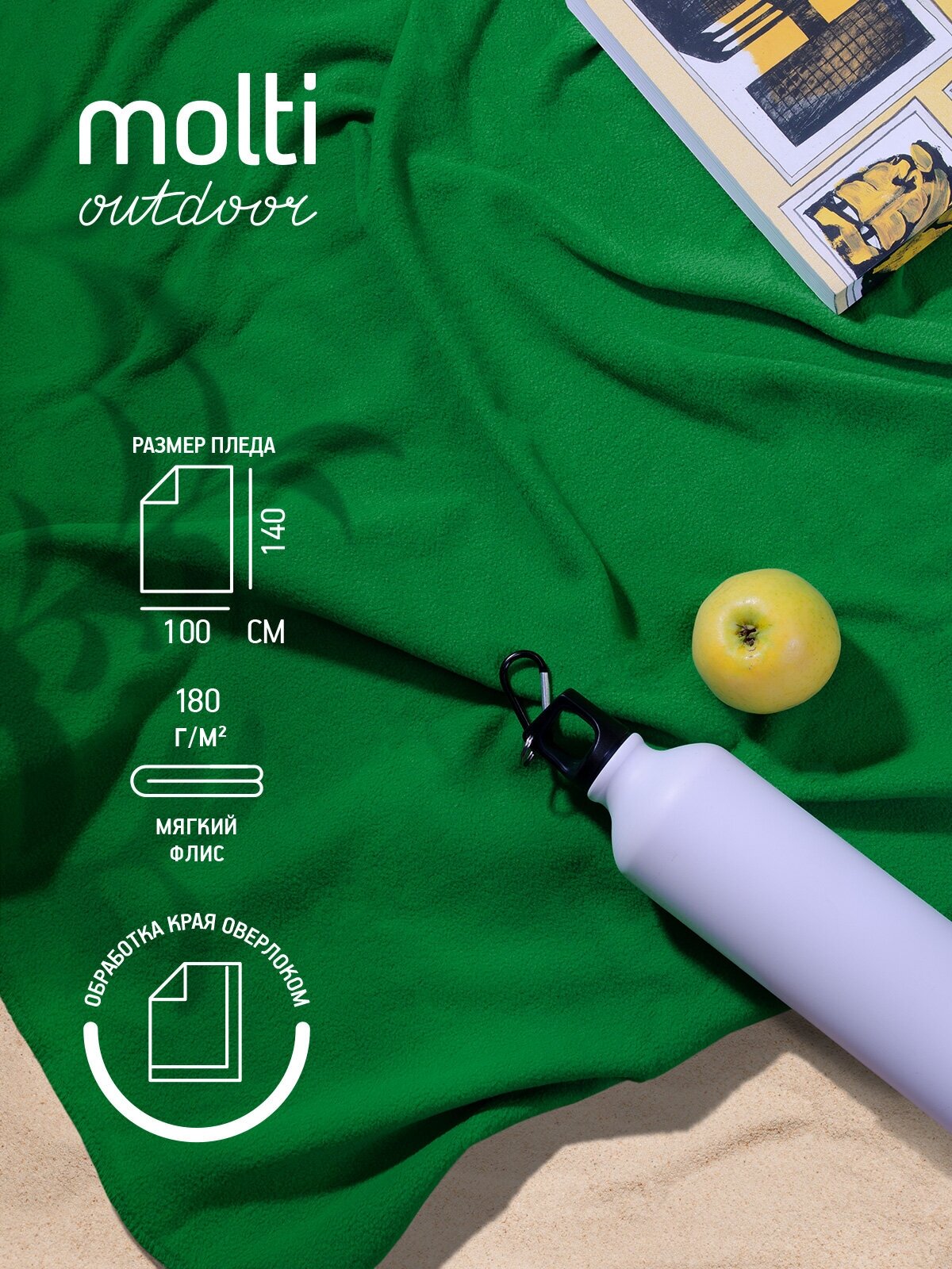 Плед флисовый molti Warm&Peace пляжное покрывало, коврик для пикника, 100х140 см, зеленый