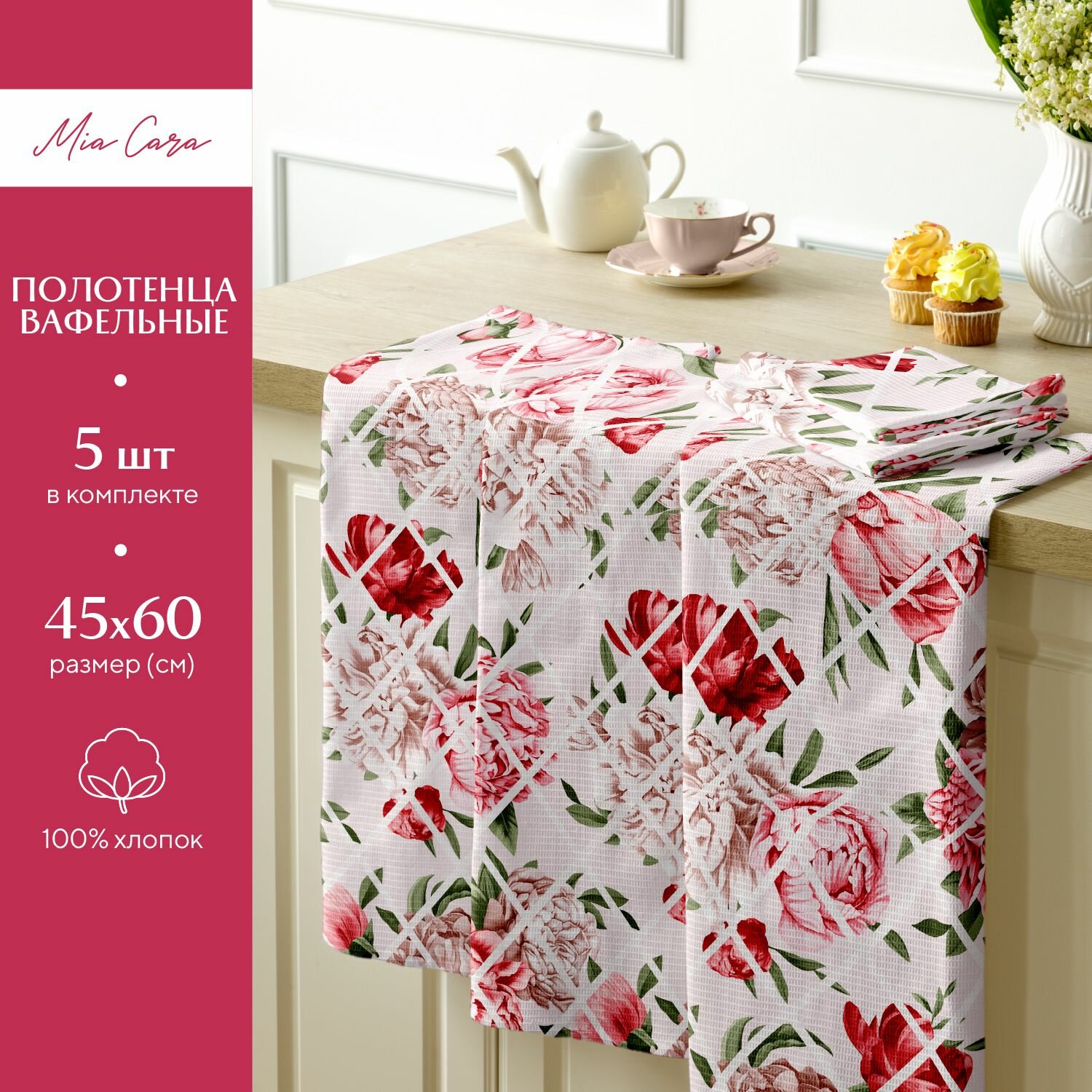 Комплект вафельных полотенец 45х60 (5 шт.) "Mia Cara" рис 14057-1 Душистый пион
