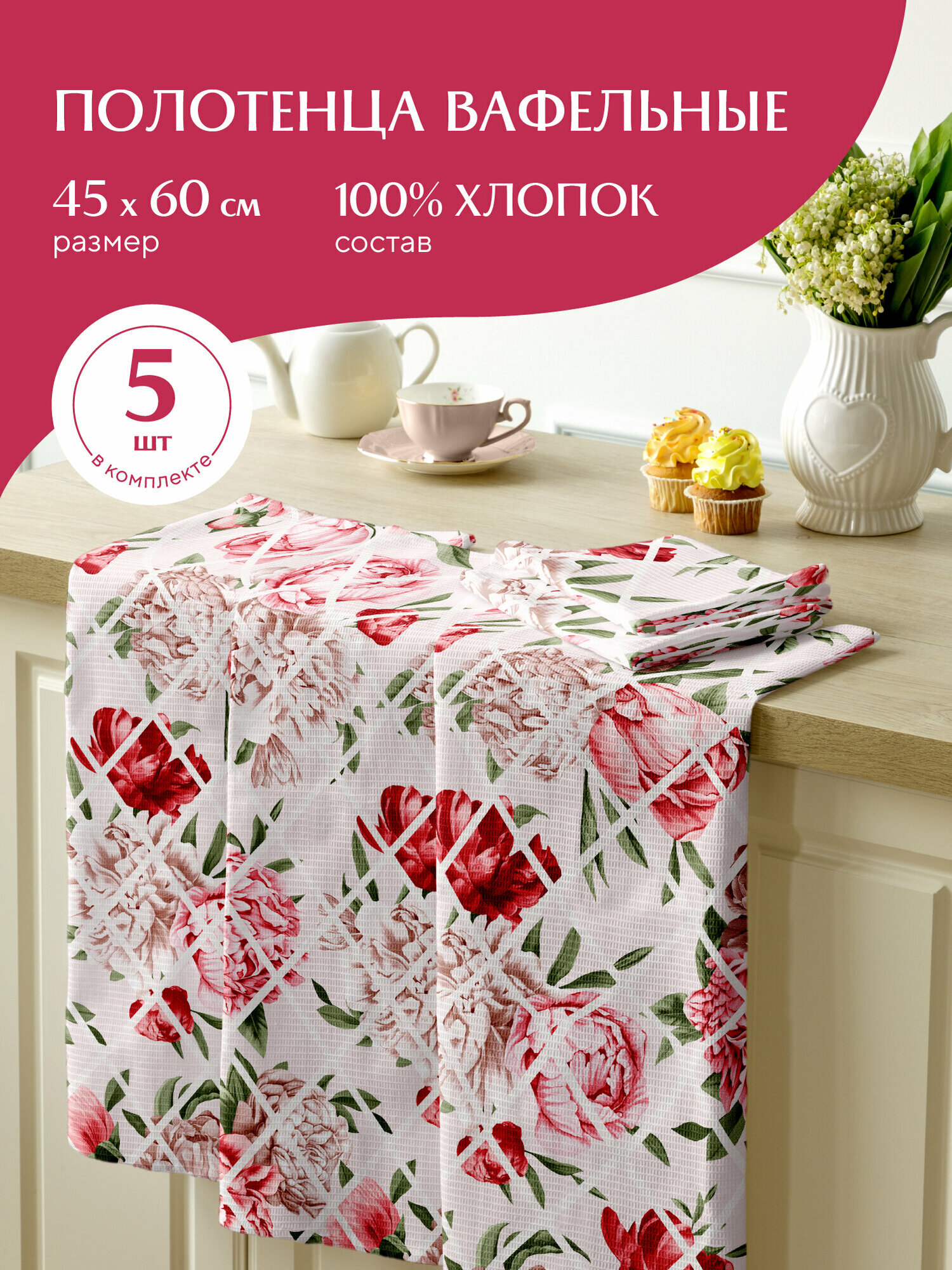 Купить Набор вафельных полотенец 45х60 (5 шт.) "Mia Cara" рис 30625-1 Scarlet