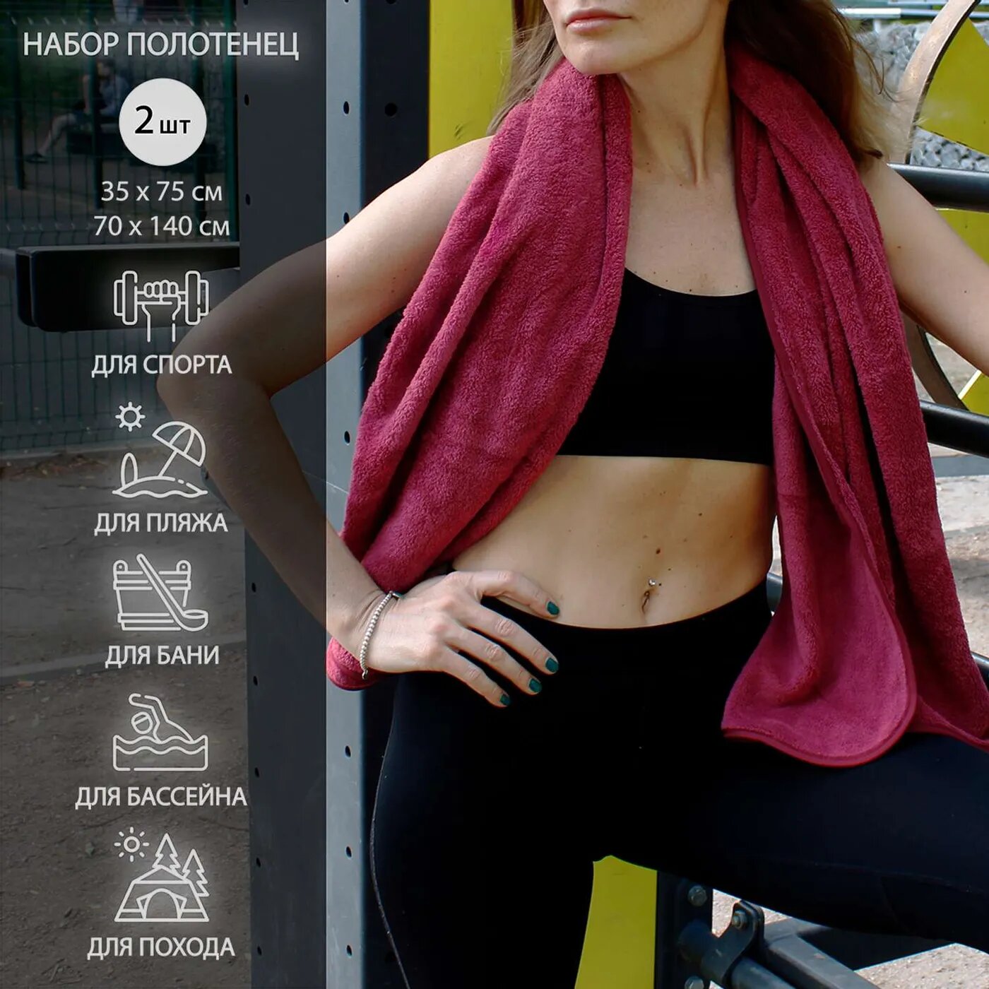 Смарт/Набор махровых полотенец 35*75 + 70*140 брусничный/Быстросохнущее пляжное полотенце для Тренировок, спорт, Йога, Фитнес, Бег, Бассейн, Баня, подарок