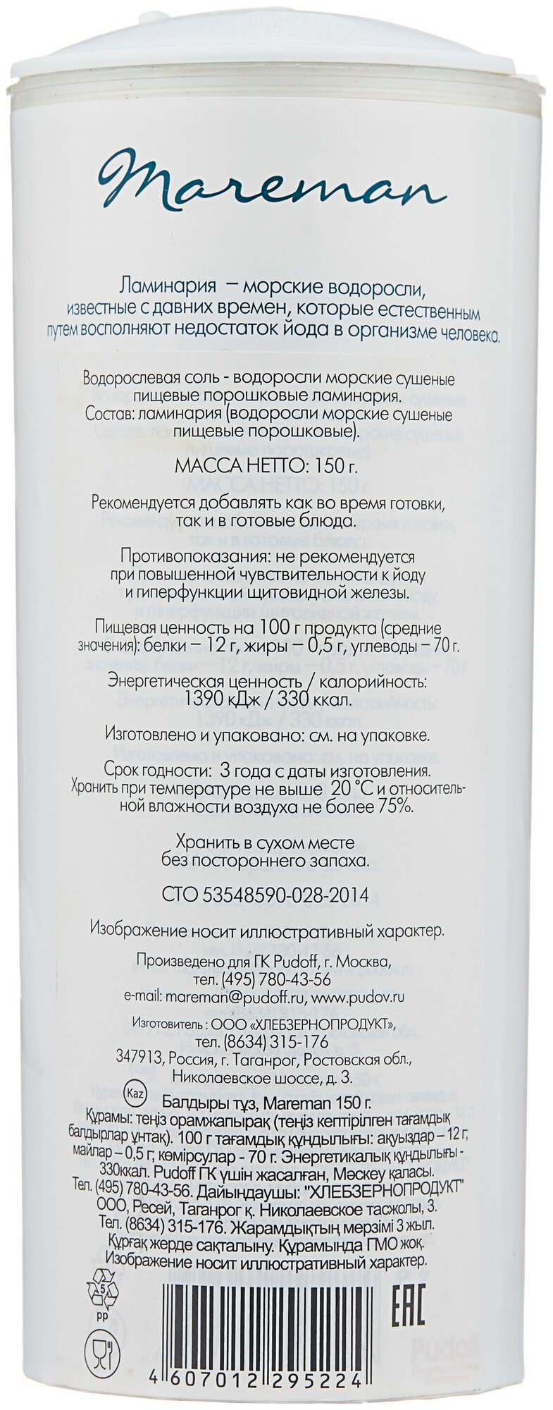 Водорослевая соль (ламинария), т.м."Mareman", 150 г интересное: