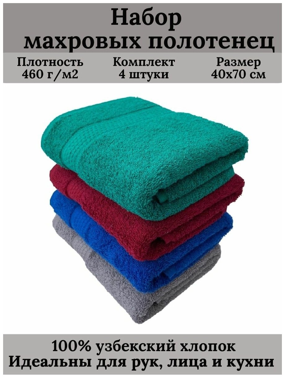 Набор махровых полотенец для рук и лица 4 штуки, 40х70 см, 460 гр.м2, 100% хлопок, разноцветный (синий, оранжевый, темно-зеленый, бордо)