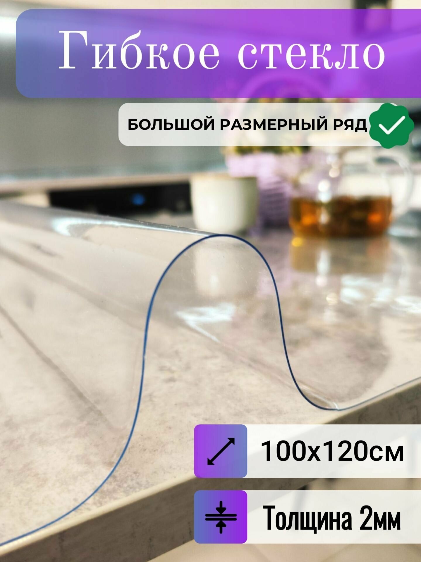 Гибкое стекло на стол 100x120см, прозрачное, ПВХ толщина 1.5 мм