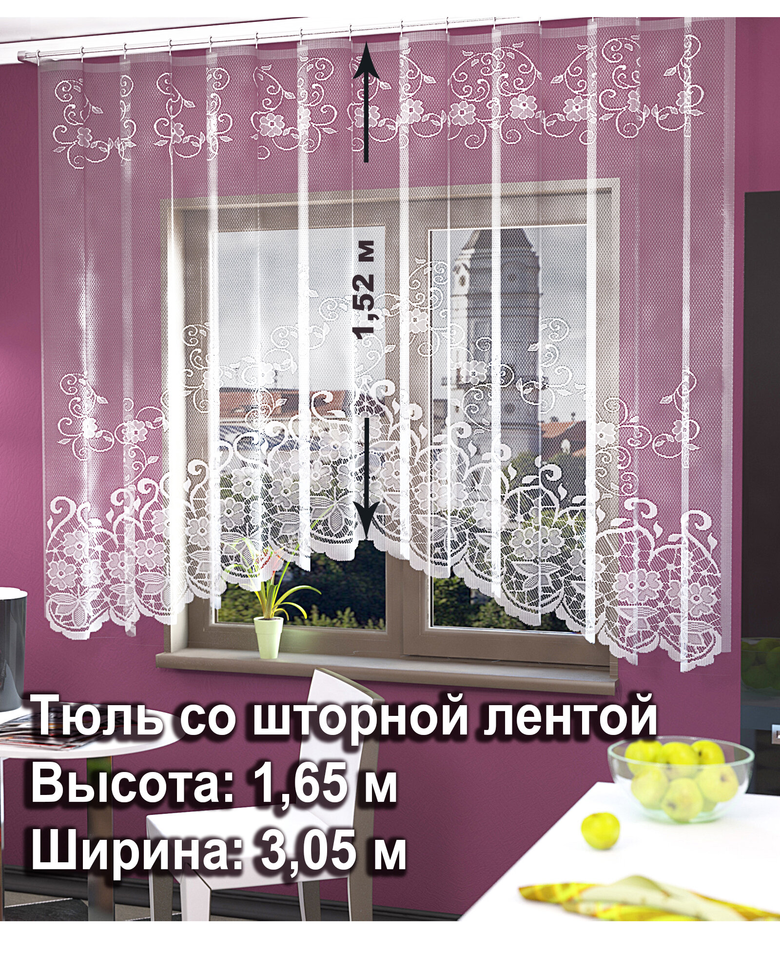 Тюль на кухню со шторной лентой, 305х165 см, цвет белый, 100% полиэстер