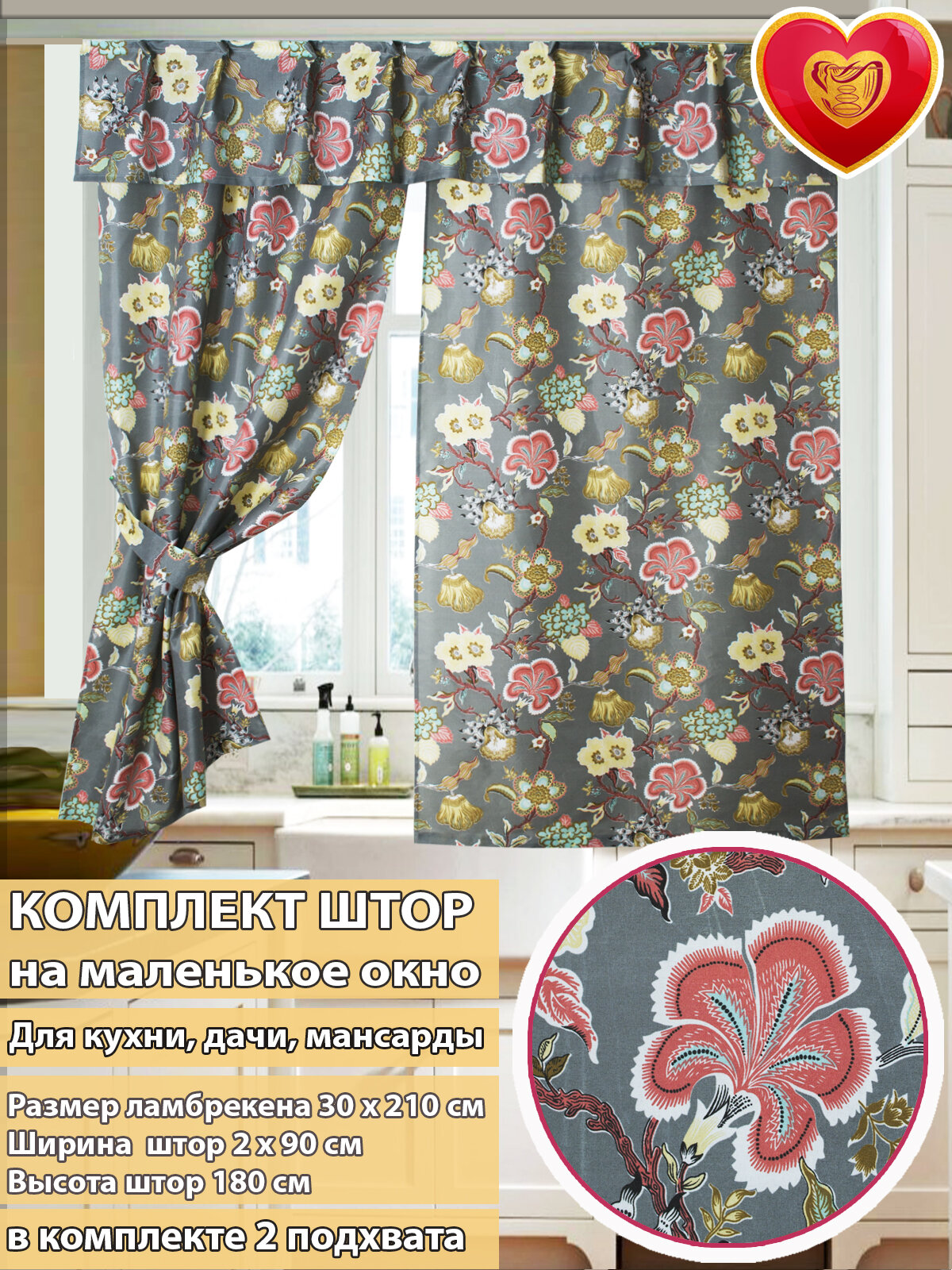Шторы для кухни короткие комплект 2 шт серый цветы интересное: